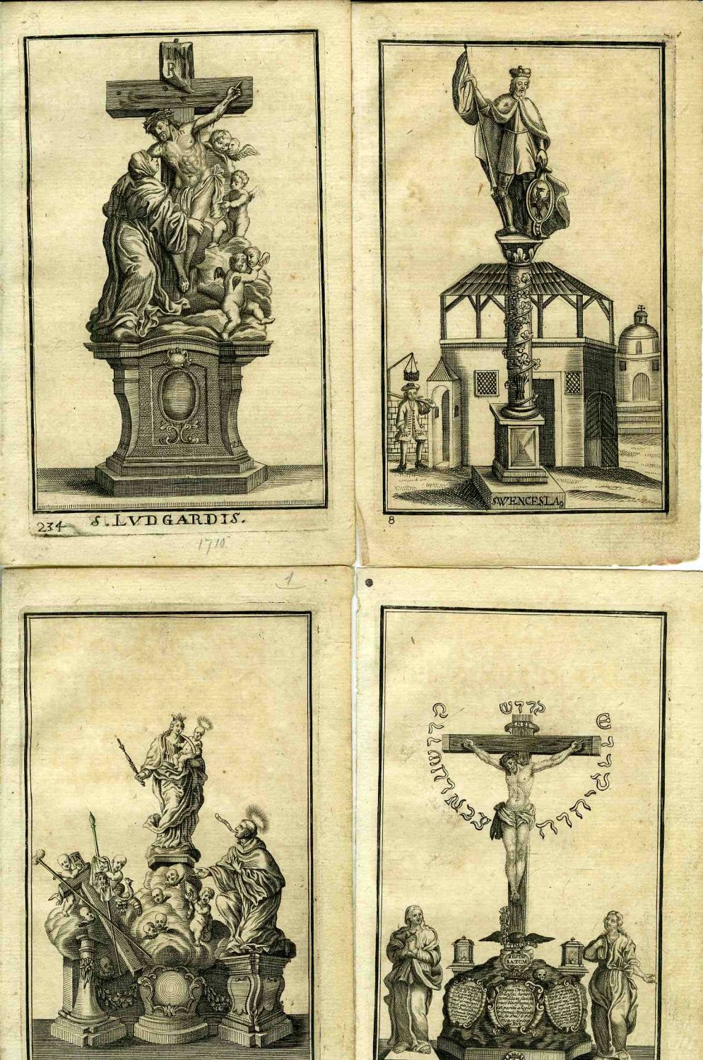 Soubor 28 z 29 mědirytin 140 x 80 mm s vyobrazením soch z Karlova mostu, volné listy o rozměru 160 x 100 mm. Přiloženo torso variantního vyobrazení Braunova sousoší Vidění sv. Luitgardy s oříznutým okrajem a chybějící spodní částí. - Místy drobné hnědé skvrnky, jedna rytina na okraji mírně natržená.