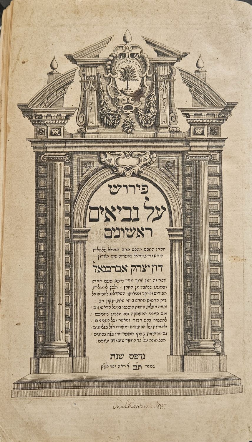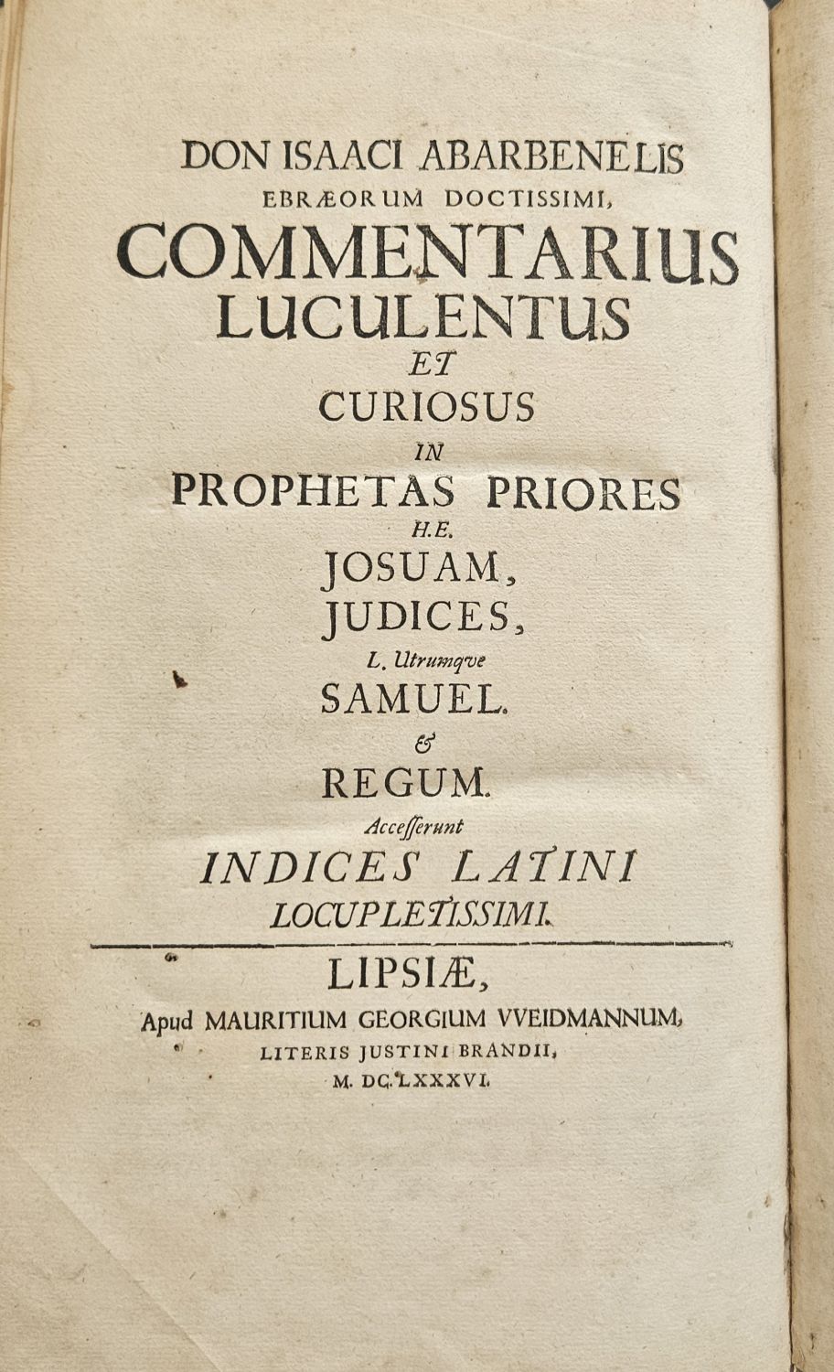 Don Isaaci Abarbenelis ebreorum doctissimi, Commentarius luculentus et curiosus in Prophetas priores h. e. Josuam, Judices, L. Utrumque Samuel et Regum. Acesserunt indices latini locupletissimi. (Peruš al nevi´im ri´šonim - transkripce titulního listu v hebrejštině)
