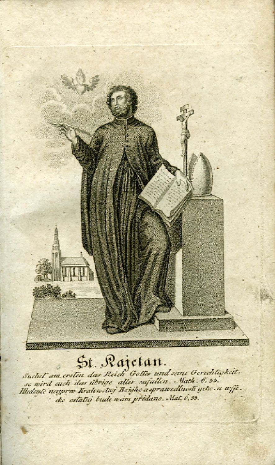 Gotika, tučně tištěné iniciálky ve výši jedné řádky, nadpisy jednotlivých pojednání o svatých oddělené od sazby jednoduchou linkou. - Vazba potažená škrobovým papírem, při horním okraji hřbetu dobový červený kožený štítek s tlačeným a zlaceným názvem, při okraji spodním tlačené a zlacené číslo svazku v oválném ozdobném zrcadle. Vazba mírně ohmataná a odřená, papír místy lehce zahnědlý. - Šestý svazek z deseti vydaných.