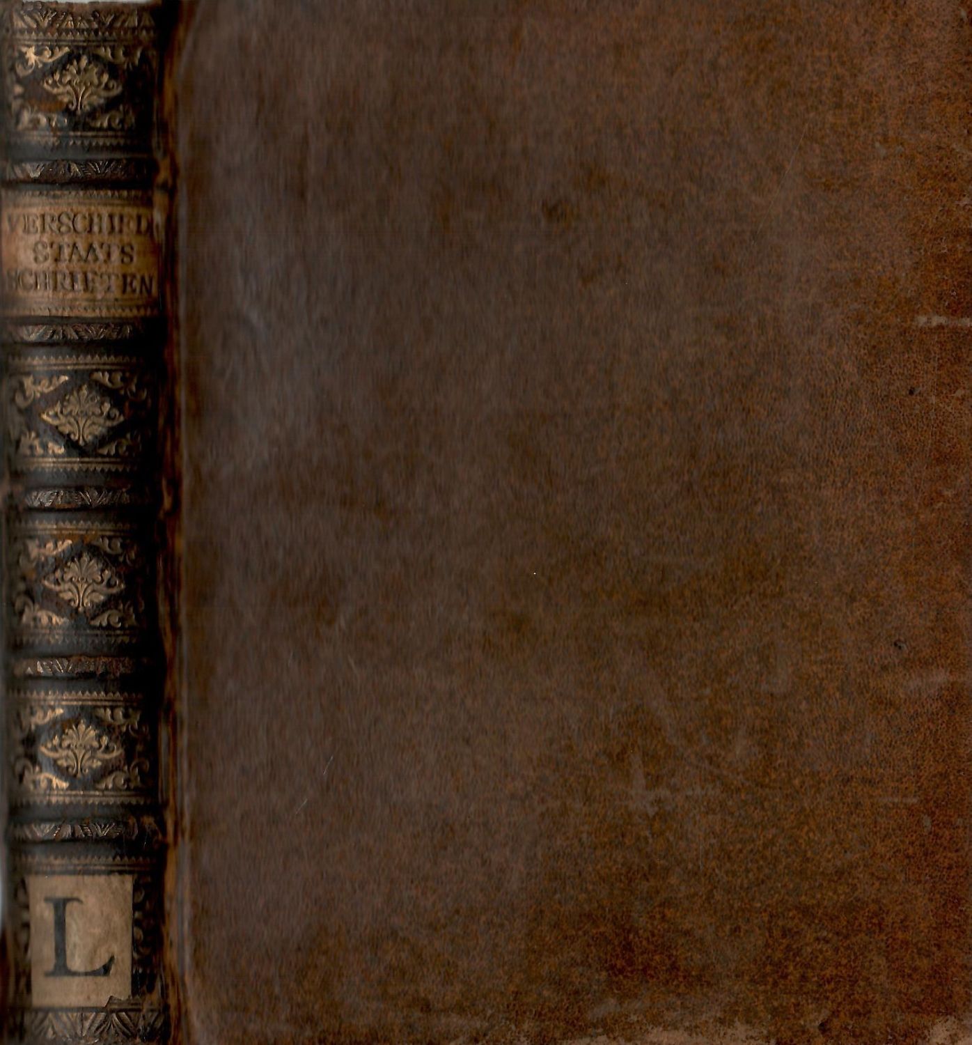 Dobová vazba z temně hnědé hověziny, ve hřbetu 5 vazů, ve druhém poli kožený štítek s tlačeným souhrnným názvem, v ostatních polích tlačený a zlacený ornament, ve spodním poli starý knih. pap. štítek s písmenem "L", červeně barvené ořízky, jednotlivá díla ve vnější ořízce vymezena dobobovým proužkem papíru. Vazba lehce ohmataná, na několika listech drobné hnědé skvrnky.