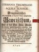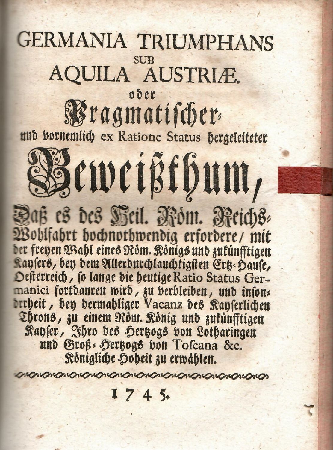 + 2. přívazek: "GERMANIA TRIUMPHANS SUB AQUILA AUSTRIAE. oder Pragmatischer und vornemlich ex Ratione Status hergeleiteter Beweißthum, Daß es des Heil. Röm. Reichs=Wohlfahrt hochnothwendig erfordere/ mit der freyen Wahl eines Röm. Königs und zukünfftigen Kaysers, bey dem Allerdurchlautigsten Ertz=Hause, Oesterreich, so lange die heutige Ratio Status Germanici fortdauren wird, zu verblieben, und insondrrheit (sic!), bey dermahliger Vacanz des Kayserlichen Throns, zu einem Röm. König und zukünfftigen Kayser, Ihro des Hertzogs von Lotharingen und Groß=Hertzogs von Toscana &c. Königliche Hoheit zu erwählen". Bez místa tisku (Wien ?), nakladatele, 1745, [VIII]-88 str., tištěno švabachem, latinský a francouzský text antikvou, pásové vlysy z rostlinného ornamentu, pásové lišty z drobného ornamentu, plné iniciály propletené úponky zalomené do výše 3-5 řádků, tučně tištěné versálky ve výši 1-2 řádků, viněty, arabská paginace stran uprostřed horního kraje mezi sluníčky, tištěné poznámky pod čarou.