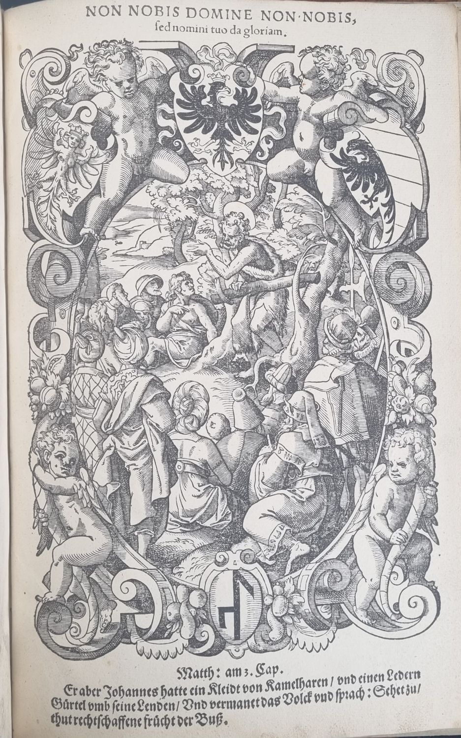 Tištěno gotikou, latinská slova antikvou, červeno-černě tištěný titulní list zakomponovaný v dřevořezové borduře. Na posledním nečíslovaném dřevořezu (ostatní římsky číslovány I-CCXIX) oválný medailon s vyobrazením Jana Křtitele oděného v rouchu z velbloudí srsti přesvědčujícího pohany, medailon je v rozích olemován andílky, uprostřed nahoře držícími císařskou orlici. Na listech XLIII až XLVI vyobrazeny kostými z Čech.