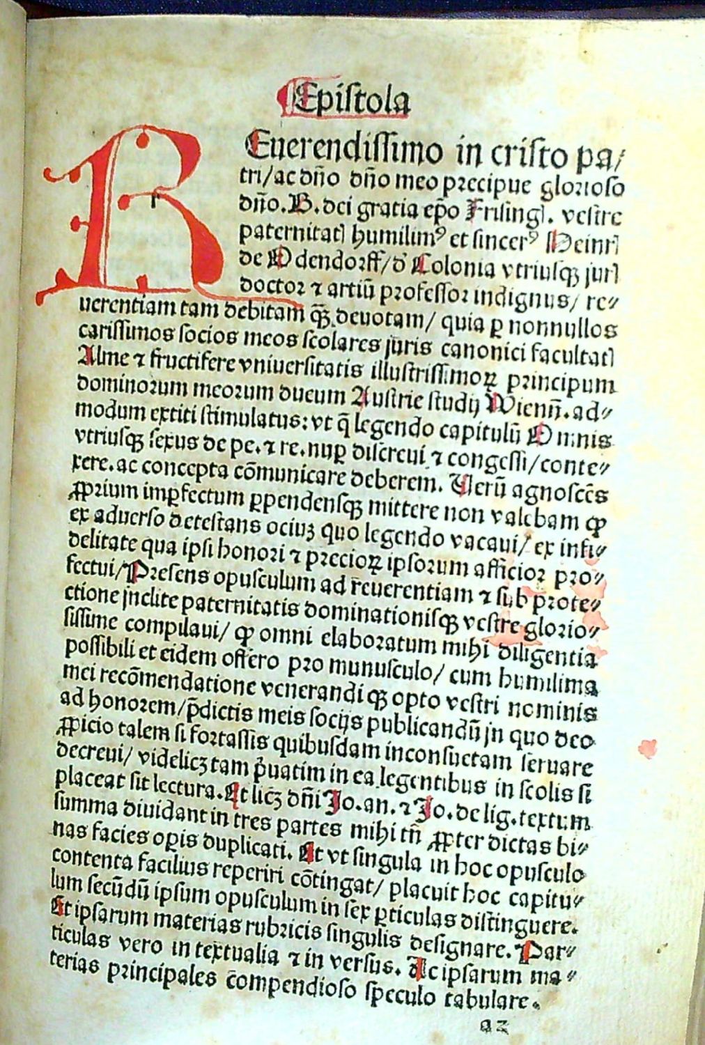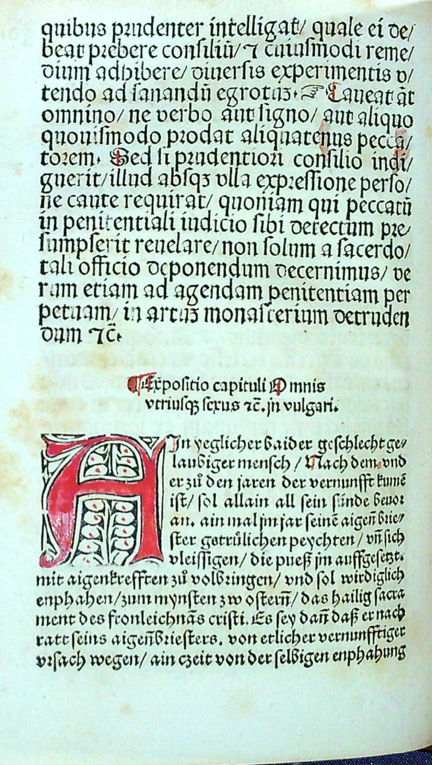 + přívazek: Odendorff, Henricus de "Repetitio capituli Omnis utrisque sexus de penitentijs et remissionibus". Memmingen, Albrecht Kunne, 1490. 16 nečísl. listů + 116 římsky pagin. (a-e8, f-r6,8, s8). Tištěno rotundou ve 32 řádcích, živá záhlaví, tištěné poznámky po stranách, římská paginace listů při horním vnějším okraji, v textu tištěné ukazovací ručičky (manicule) - jeden z prvních známých příkladů v tisku použitých, červeně rubrikováno, červeně psané iniciály, na foliu c1 verso červeně malovaná iniciála bíle orámovaná a vyplněná malovaným rostlinným motivem (uvozuje částečně na dvou stranách tištěný text v němčině). V textu několik rkp. marginálií červeným a hnědým inkoustem. První vydání. (Hain 11957; BMC II,605; ISTC io00023000.
