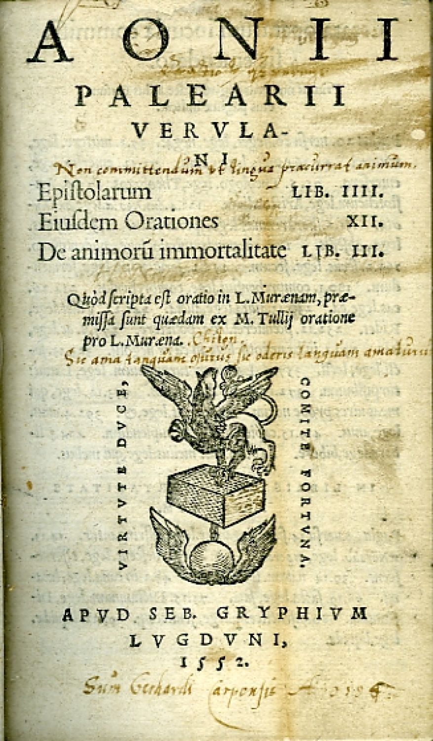 Na titulních listech tiskařův signet, konturové iniciály na ilustrativním pozadí s lidskými postavami a zvířaty zalomené do výše 6-9 řádků, v úvodu jednotlivých kapitol iniciály v jednoduchém rámečku na rostlinném, částečně ilustrativním pozadí zalomené do výše 4 řádků, tučně tištěné versálky ve výši 2 řádků, živá záhlaví, řecká text alfabetou, na straně 211 mezititul (Orationes), třetí část (De animoru) samostatně paginovaná a opatřená vlastním titulním listem, na konci varianta tiskařova signetu s vyobrazením gryfa. - Vazba z temně hnědé hověziny z počátku 21. století od významného knihvazače a restaurátora Tomáše Vyskočila. Na přední i zadní desce je zakomponován do vazby zbytek původního pokryvu, rám z ornamentů. Ve hřbetu 5 vazů, ručně šitý kapitálek, strana 45 v prvé části je vevázána za str. 48. Knižní blok při horním okraji oříznutý po živé záhlaví, papír odkyselený. Na titulním listu rkp. marginálie a provenienční přípis jednoho z předchozích majitelů knihy (Gerhard Carpons), v textu místy podtrháváno a na několika místech po stranách rkp. marginálie. - Aonian či Antonius Palearius Verulanus (1503 Veroli - 1570 Řím), byl italský lékař a filosof, humanista. Profesor na universitě v Sieně.