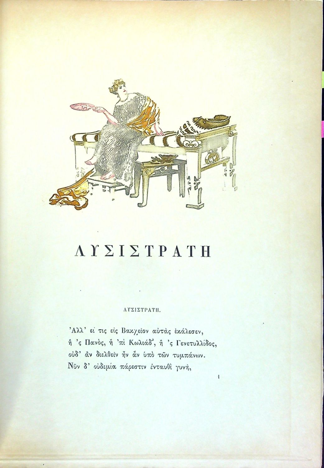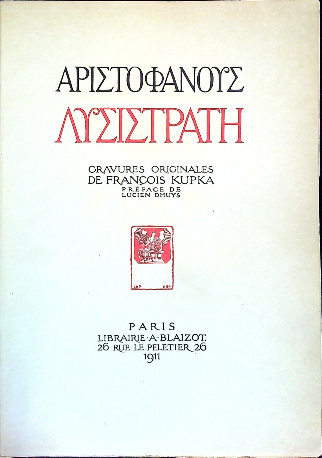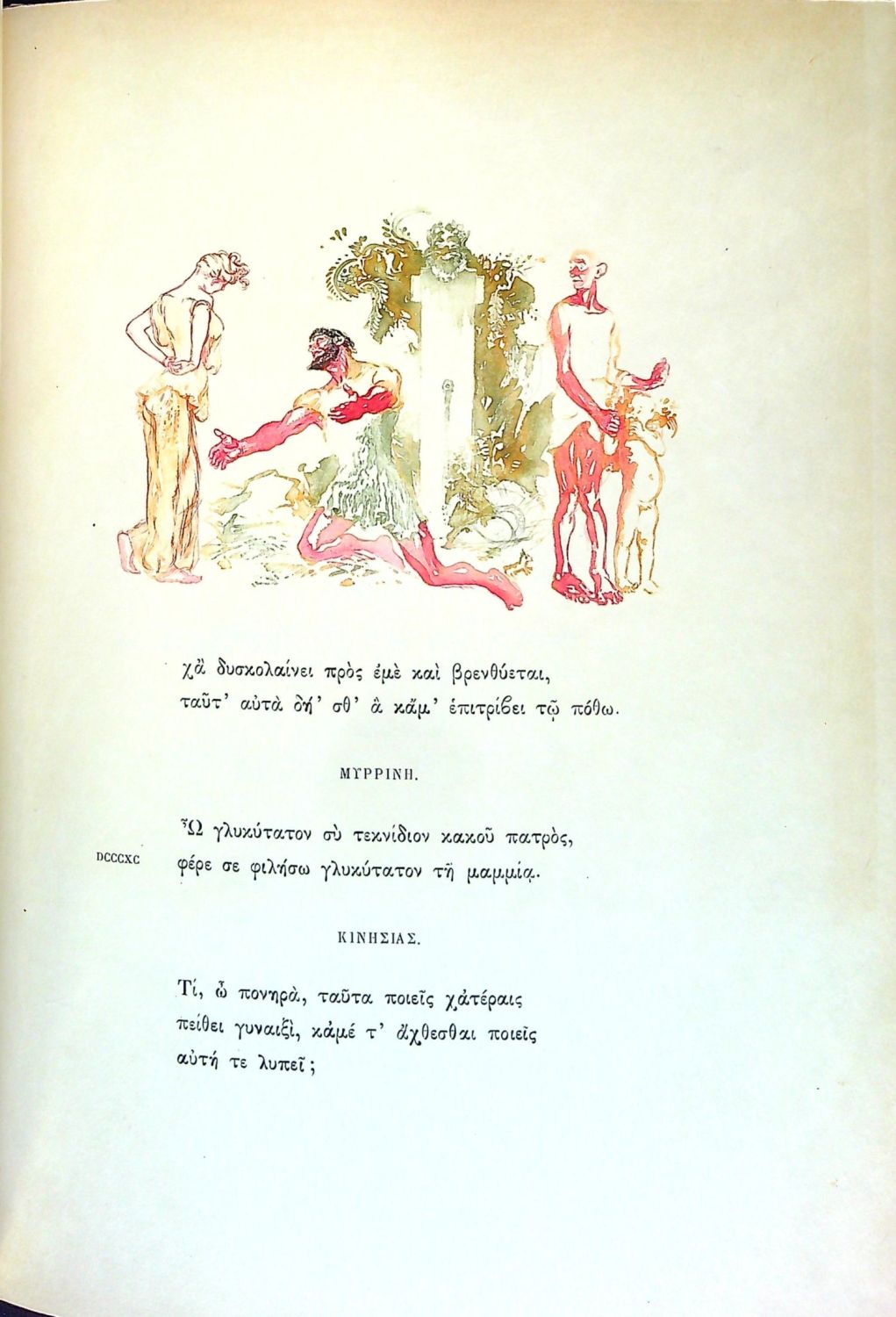 Ex. č. 9 z 10 vydaných v řeckém jazyce a rezervovaných pro helenisty (krom toho vyšlo ve francouzštině 100 ex. přednostního vydání tištěného na císařském japanu a 150 ex. na velínu). Lepty vytiskl na ručním lisu Alfred Porcabeuf, typograficky upravil Philippe Renouard, úvodním slovem ve francouzském jazyce opatřil Lucien Dhuys. Červeno-černě tištěný tit. list s vinětou, v textu 12 drobných černobílých vinět ( z toho tři odlišné od francouského vydání). - Původní pap. obálka s chlopněmi, na přední straně červeno-černě přetištěný titulní list. Rozměr knižního bloku 290x202 mm.