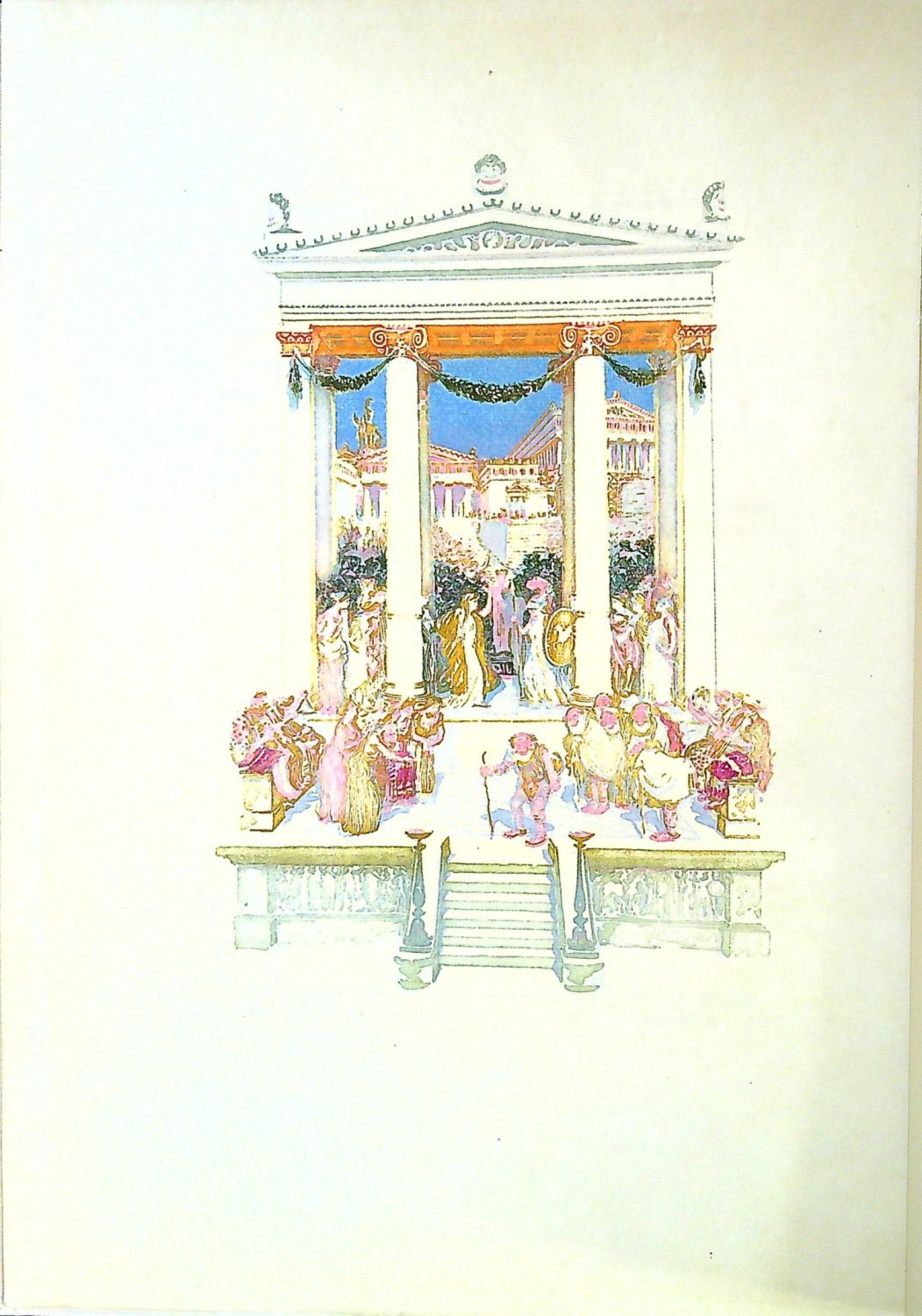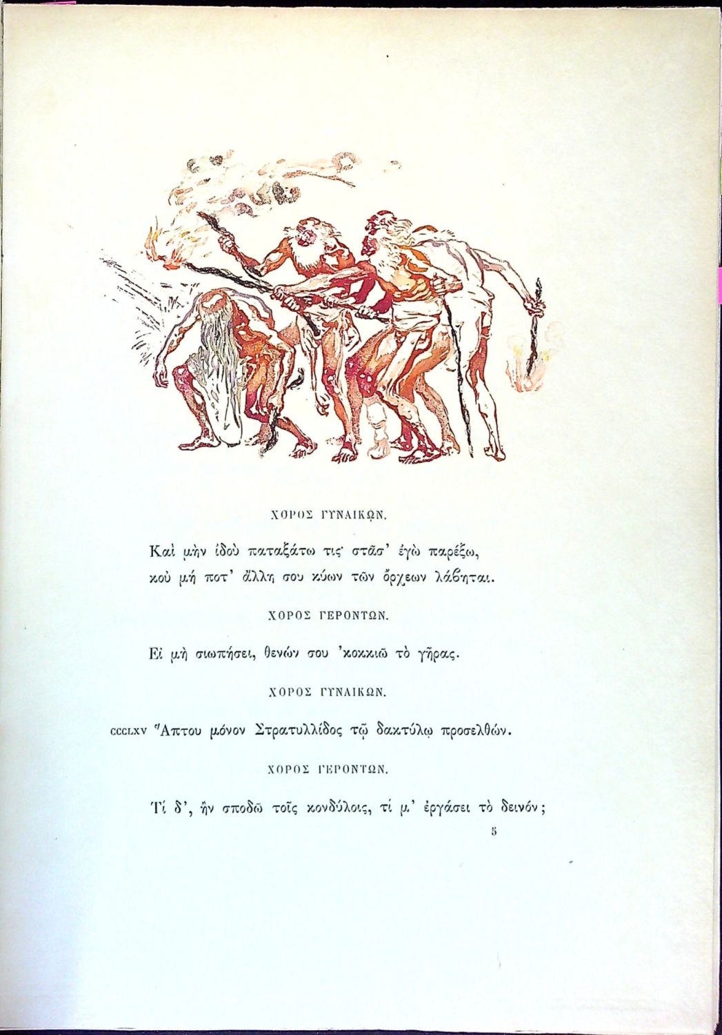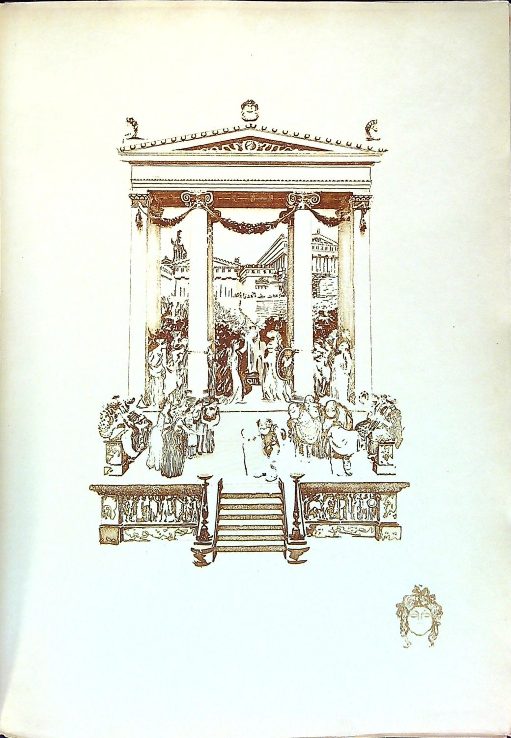 Ex. č. 9 z 10 vydaných v řeckém jazyce a rezervovaných pro helenisty (krom toho vyšlo ve francouzštině 100 ex. přednostního vydání tištěného na císařském japanu a 150 ex. na velínu). Lepty vytiskl na ručním lisu Alfred Porcabeuf, typograficky upravil Philippe Renouard, úvodním slovem ve francouzském jazyce opatřil Lucien Dhuys. Červeno-černě tištěný tit. list s vinětou, v textu 12 drobných černobílých vinět ( z toho tři odlišné od francouského vydání). - Původní pap. obálka s chlopněmi, na přední straně červeno-černě přetištěný titulní list. Rozměr knižního bloku 290x202 mm.