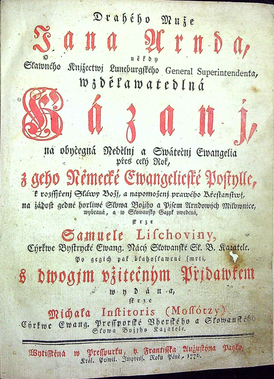 Drahého Muže Jana Arnda někdy Slawného Knjžectwj Luneburgského General Superintendenta, wzdělawatedlná Kázanj, na obyčegná Nedělnj a Swátečnj Ewangelia přes celý Rok, z geho Německé Ewangelicské Postylle, k rozssjřenj Sláwy Božj, a napomoženj prawého Křestanstwj, na žádost gedné horliwé Slowa Božjho a Pjsem Arndowých Milownice, wybraná, a w Slowansky Gazyk vwedená skrze Samuele Lischoviny, Cýrkwe Bystrycké Ewang. Nácý Sľowanské St. B. Kazatele. Po gegich pak blahoslawené smrti. S dwogjm vžitečným Přjdawkem wydána skrze Michala Institoris (Mossótzy) Cýrkwe Ewang. Pressporské Vherského a Sľowanského Slowa Božjho Kazatele.