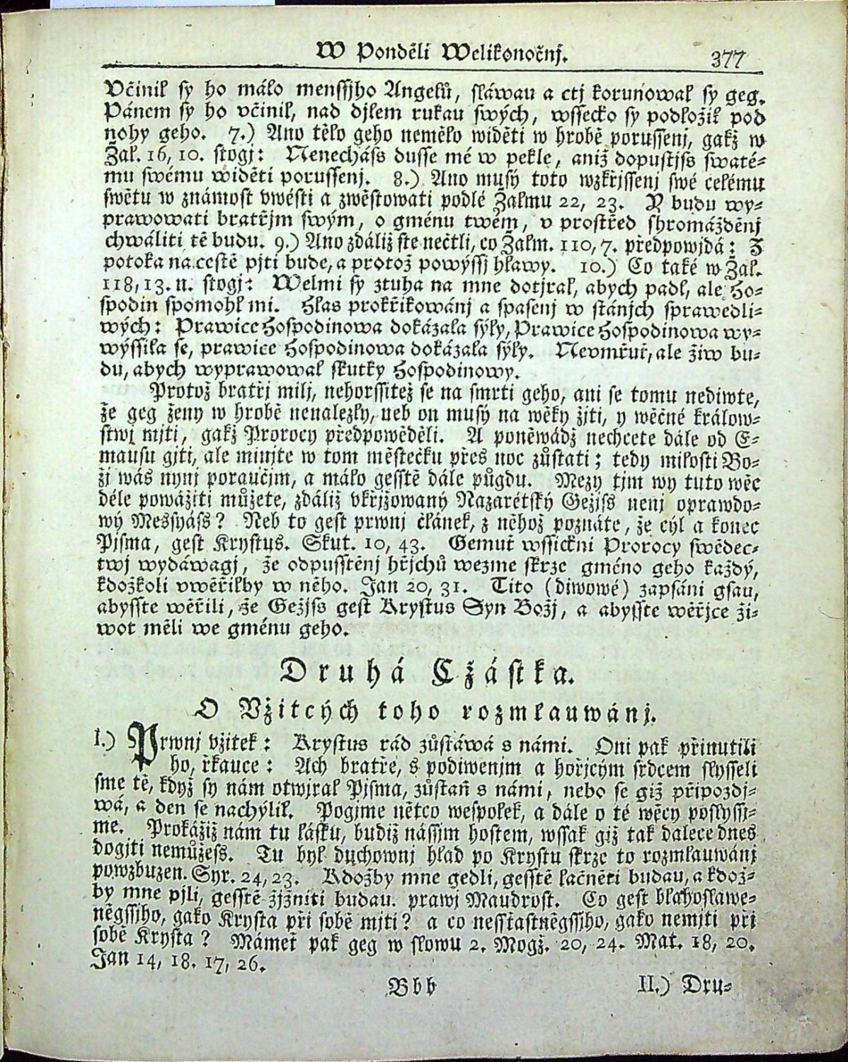 Tištěno švabachem, latinský text antikvou, červeno-černě tištěný titulní list. Živá záhlaví od sazby oddělená jednoduchou linkou, tištěné poznámky pod čarou. Ozdobné tyče, dvojité linky, tučně tištěné versálky a iniciálky ve výši 2 řádků, pásové vlysy s ilustracemi, viněty. Od strany 481 druhý díl, za stranou 836 titulní list "Prwnj Přjdawek K Arndowě Ewangelicské Postylli,...", na straně 34 "Druhá Přjdawek", přídavky paginované přůběžně (str. 1-58).