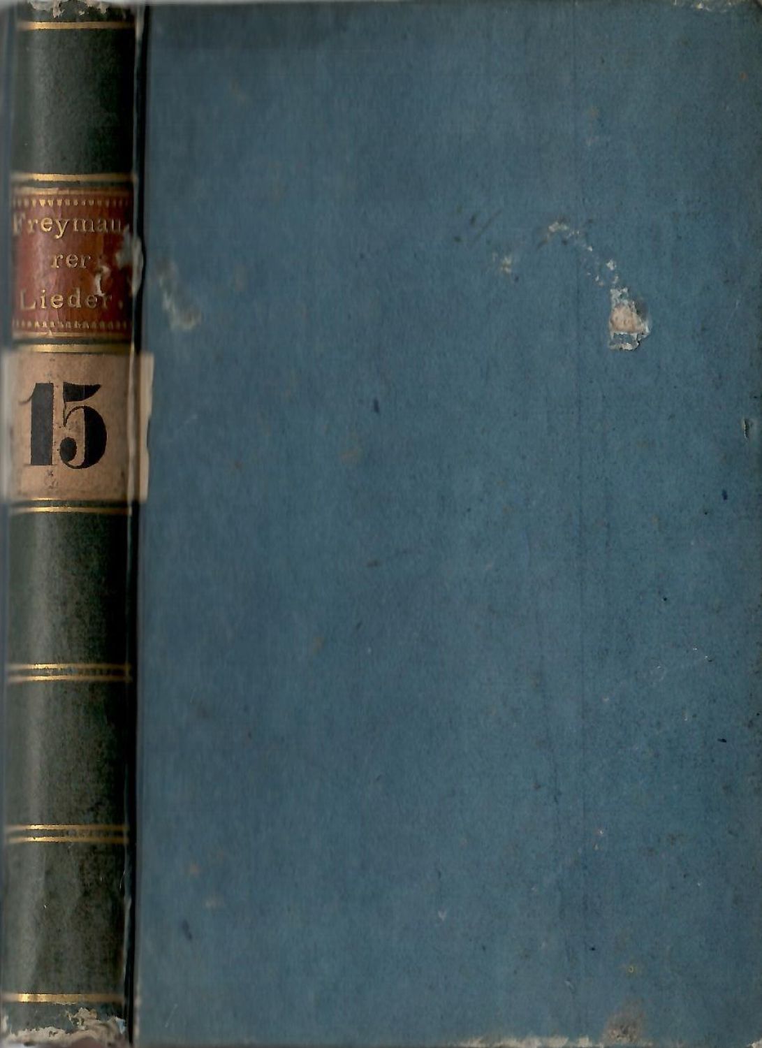 Dobová kartonová vazba s modře barveným pap. pokryvem, hřbet dvojitou linkou členěnýdo 6 polí, ve druhém poli původní dobový vínově červený kožený štítek s tlačeným a zlaceným názvem, ve třetím poli starý pap. knih. štítek s číslem. Na přední desce na jednom místě pap. pokryv odřený, též při okraji koženého štítku kůže odřená, naražené rohy. Na předním přídeští staré razítko zednářské lóže "Zu den drei Bergen" ve Freibergu.