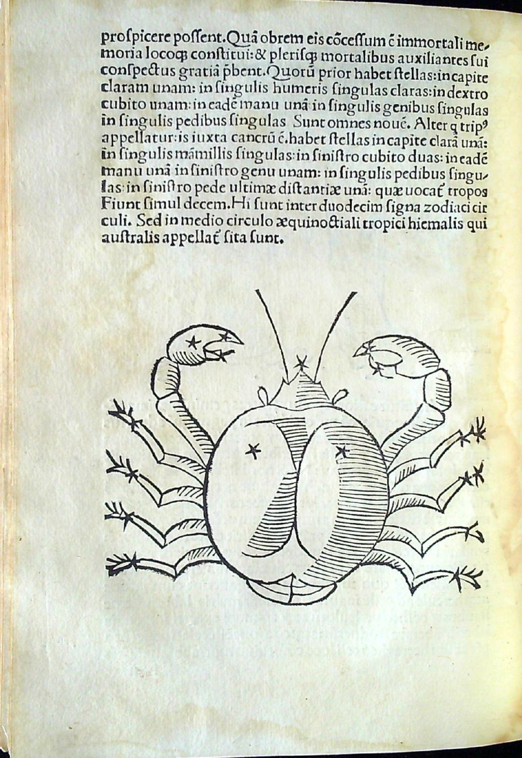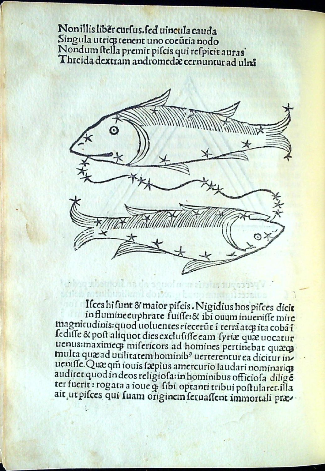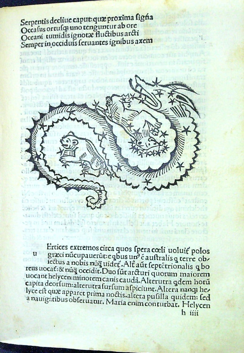 Tisk antikvou ve 38 řádcích, nadpisy tištěné versálkami, vynechaná místa pro iniciály s předtištěnou reprezentantou pro rubrikátora. Nepaginováno (a10, b-p8 - folia a1, g8, p7-8 nepotištěná). V části Phaenomena v textu 38 dřevořezových ilustrací (na foliu H2a zvěrokruh, na dalších stranách alegorická vyobrazení zvířetníkových a jiných souhvězdí), které jsou zčásti stranově obrácenými kopiemi dřevořezů Thomase de Blavise, které vyšly poprvé v Benátkách u Ratdolta jako doprovod ke knize "Poetica astronomica" od Hyginuse v Benátkách roku 1485.