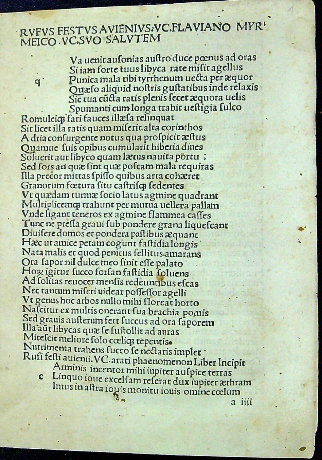 Opera [Ed: Victor Pisanus, Lorenzo Valla]. Add: Avienus: Flaviano myrmeico (Arati: Phaenomena, Tr. Avienus). Dionysius Periegetes: De situ orbis " (Tr. Avienus). Avienus: Ora maritima. Arati: Phaenomena (Tr. Germanicus with comm.). Arati: Phaenomena (Tr. Cicero). Quintus Serenus Sammonicus: Liber medicinalis.