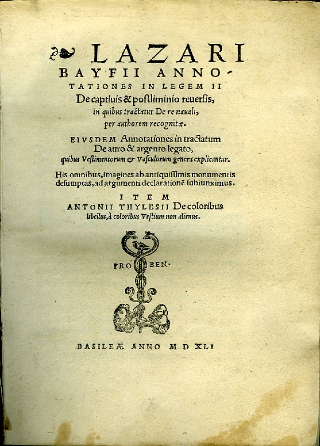 Annotationes in legem II De captiuis & postliminio reuersis, in quibus tractatur De re nauali, per authorem recognitæ. EIVSDEM Annotationes in tractatum De auro & argento legato, quibus Vestimentorum & Vasculorum genera explicantur. His omnibus, imagines ab antiquissimis monumentis desumptas, ad argumenti declaratione subiunximus. ITEM ANTONII THYLESII De coloribus libellus, à coloribus Vestium non alienus.