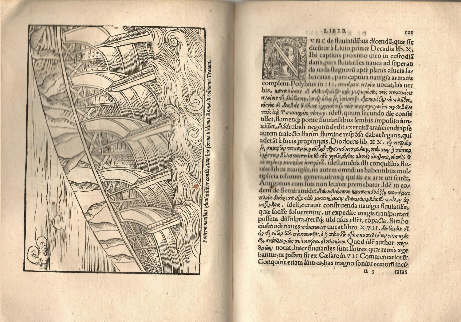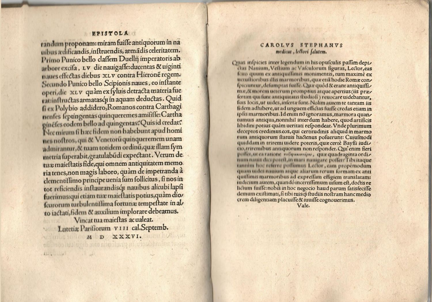 Latinský text s rozsáhlými řeckými citacemi. Pergamenová vazba silně pomačkaná a ušpiněná, při horním okraji hřbetu natržená, vázací tkanice chbějí, stopa po hřbetním štítku. Přední předsádka ušpiněná, na okraji roztřepená, verso pozn. tužkou, tit. list s hnědými skvrnkami na spodním okraji, poslední potištěný list s drobným otvorem tamtéž, horní rohy zadních listů se slabou stopou po vlhkosti, na zadním přídeští pozn. inkoustem. Vcelku však pěkný exemplář se širokými okraji. - Svazek obsahuje tři spisy francouzského diplomata, humanisty Lazara de Baif (cca 1496-1547) o lodích a lodní dopravě, antickém odívání a nádobách, vyzdobené dřevořezy, jež se poprvé objevily v první ilustrované knize pařížského tiskaře, nakladatele a lexikografa Roberta Estienna (cca 1503-1559). Ilustrace jsou volnými přetisky pařížského vydání, jejichž autorství je přisuzováno buď švýcarskému umělci Conradu Schnittovi či malíři, dřevořezbáři a nakladateli Heinrichu Vogtherrovi. Toto třetí vydání, stejně jako identické druhé z r. 1537 bylo připraveno bratrem R. Estienna, Charlesem (Carolsu Stephanus) a věnováno francouzskému králi Františkovi I. z Valois. Obshauje spisy: "De re navali", "De re vestiaria" a "De vasculis". V tomto exempláři chybí spis čtvrtý, monografie o barvách "De coloribus libellus" Antonia Telesia, a 4 poslední nečísl. listy s rejstříkem a kolofonem s tisk. signetem.