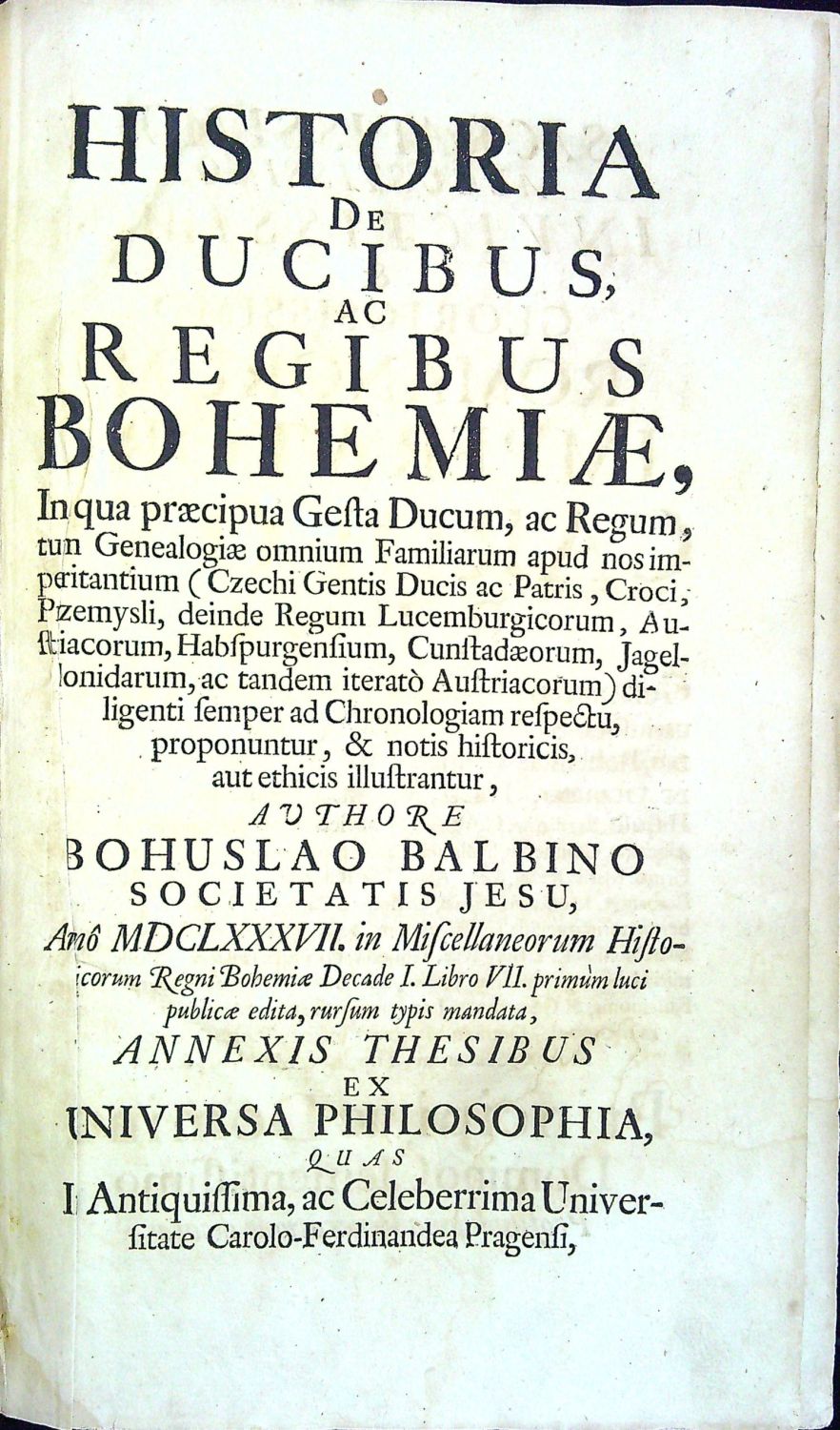 HISTORIA DE DUCIBUS, AC REGIBUS BOHEMIAE, In qua praecipua Gesta Ducum, ac Regum, tum Genealogiae omnium Familiarum apud nos imperitantium (Czechi Gentis Ducis ac Patris, Croci, Przemysli, deinde Regum Lucemburgicorum, Austriacorum, Habspurgensium, Cunstadaerum, Jagellonidarum, ac tandem iterato Austriacorum) diligenti semper ad Chronologiam respectu, proponuntur, & notis historicis, aut ethicis illustrantur, ....