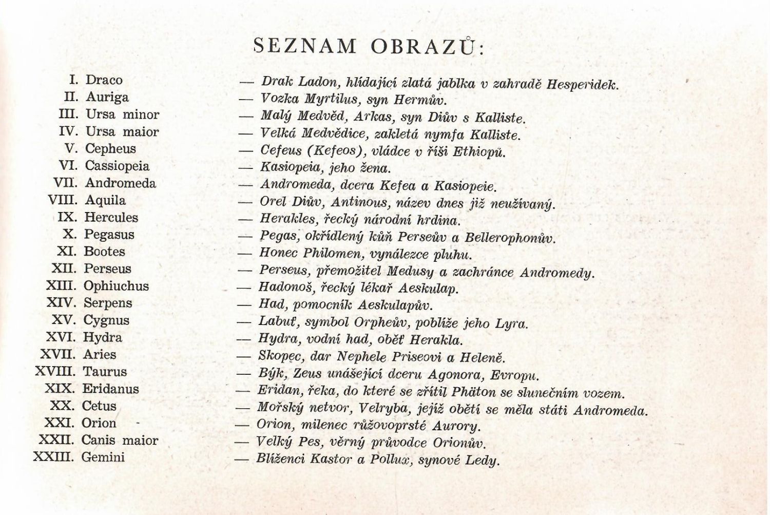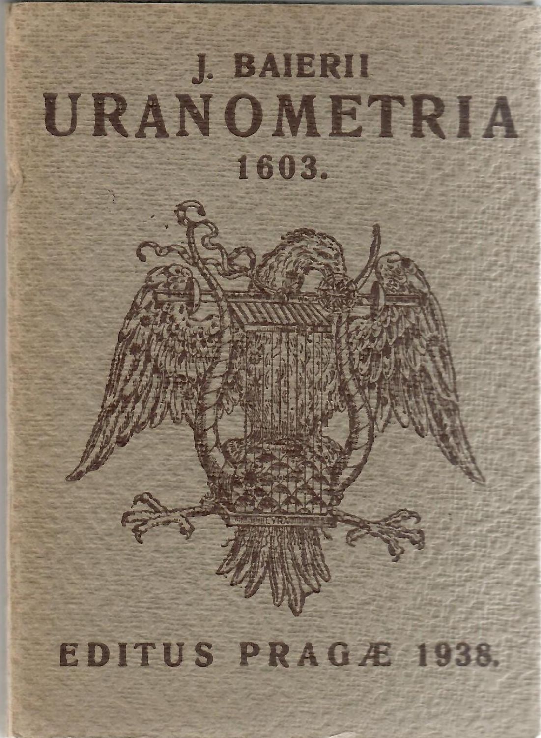 36 tabulí po jedné straně tištěných s vyobrazením významných souhvězdí severní a jižní oblohy s vyobrazením jejich atributů a latinských názvů. Původní papírové pouzdro se zasunovací chlopní, na přední straně název a orlice s lyrou. - Johann Bayer (1572 - 1625), německý astronom a právník, který roku 1603 vydal atlas hvězdné oblohy "Uranometrii".