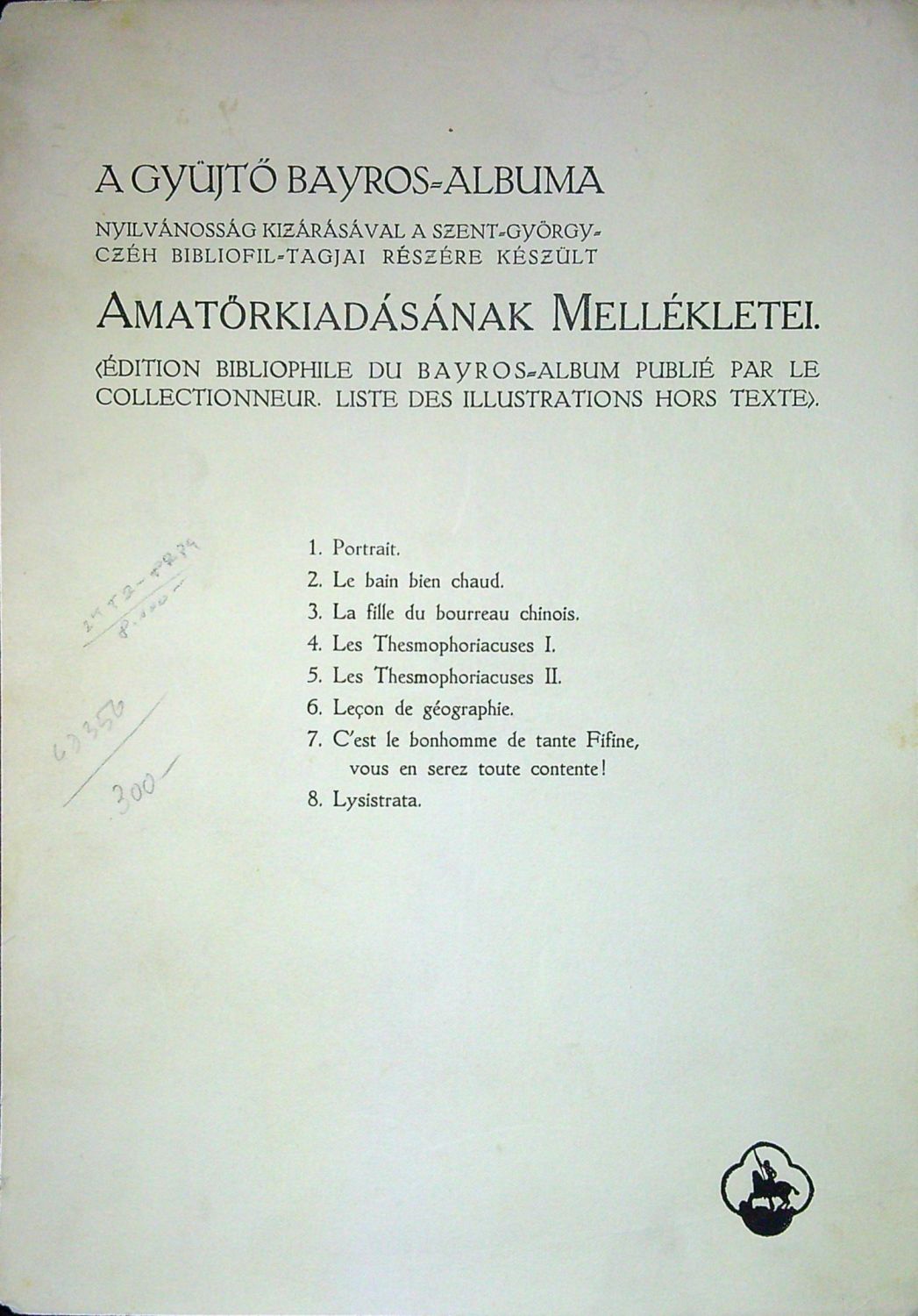 Album osmi erotických kreseb Bayrosových ofsetem reprodukovaných. Každá reprodukce je namontována při horních okrajích na tužší podkladový papír a na přední straně je zakryta jemným papírem při jehož horním vnitřním okraji je modře tištěná reprodukce Bayrosovy kresby a při spodním okraji nad značkou edice modře tištěný název (původní adjustace). Na titulním listu je tištěný název v maďarském a francouzském jazyce a seznam listů ve francouzštině.