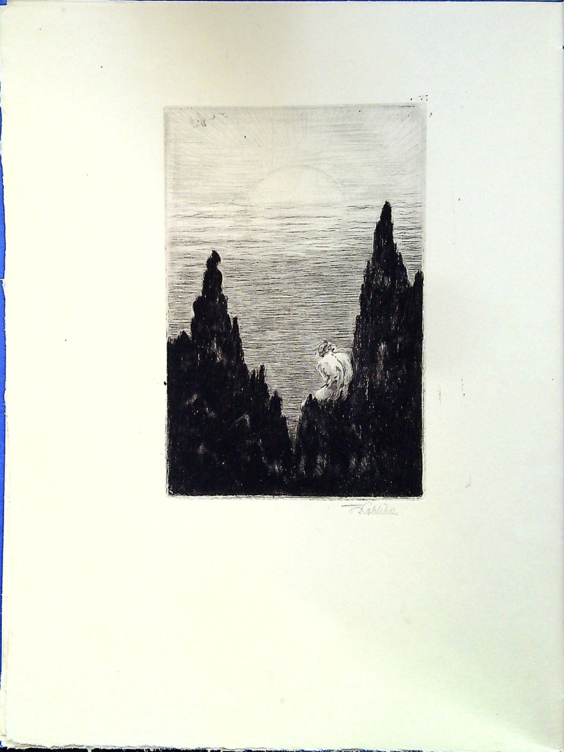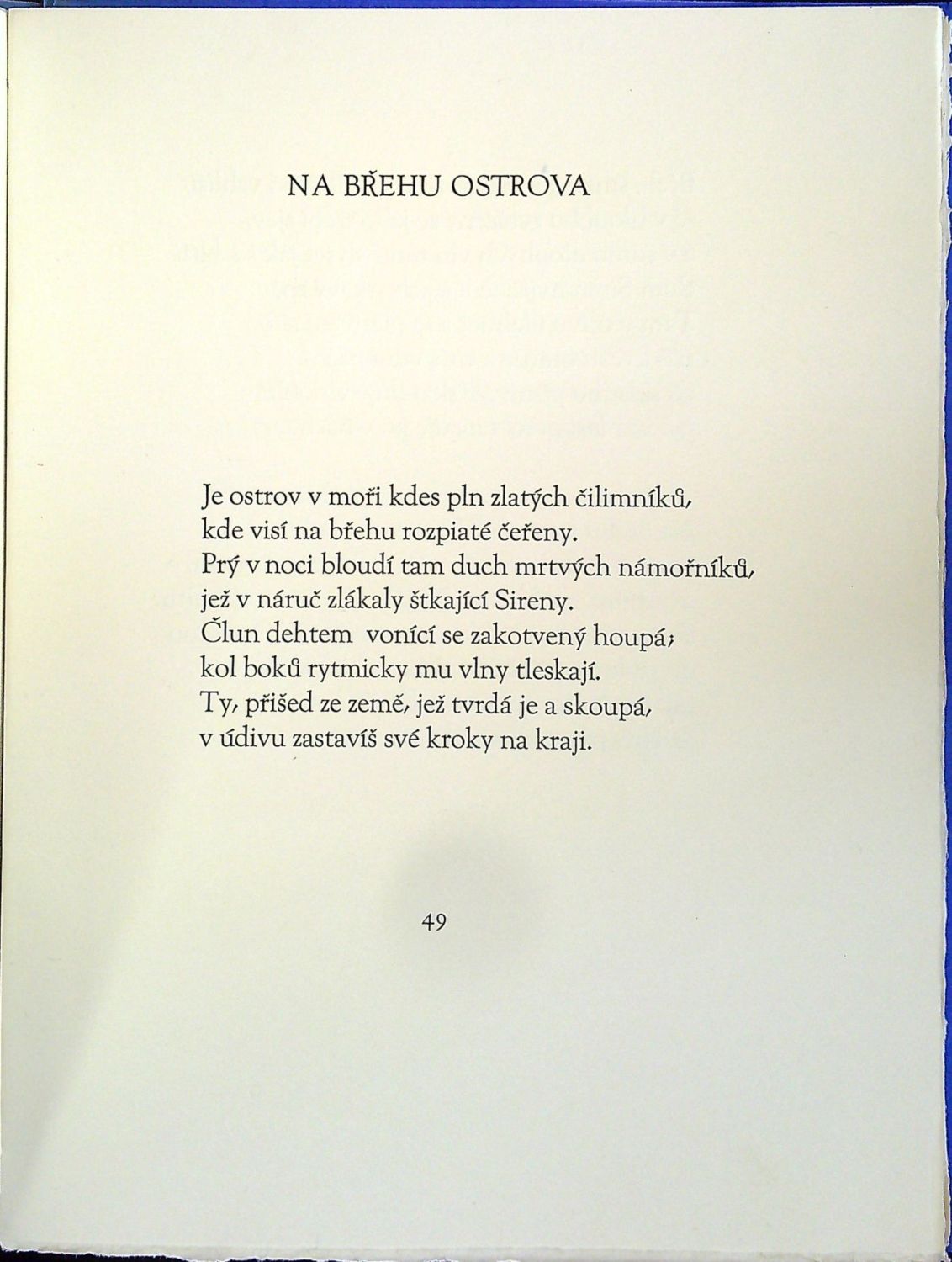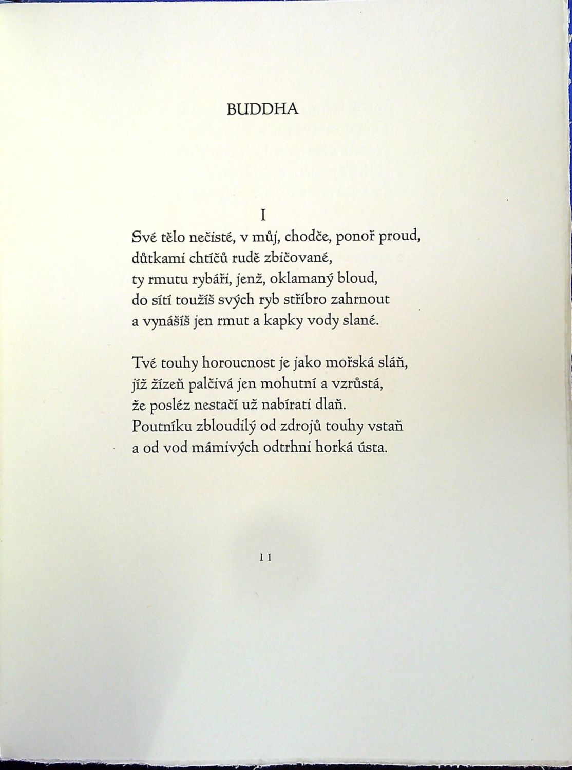 Výtisk č. 8 z 22 na císařském japanu (celkový náklad 77 ručně čísl. výt.). Typograficky upravil F. Kobliha a vydal jako svůj 10. tisk. Kniha byla vysázena z písma Goudyho, Fournierova, Malostranské antiky, Janssonova a Cloister a vytištěna ve Státní tiskárně v Praze. K výtiskům na japanu byly připojeny sledy suchých jehel. Na patitulu podpis autora. Titul tištěn černě a červeně. - Původní modrá obálka s chlopněmi, ve které je nití šitý knižní blok, sledy suchých jehel v původní modré obálce a volně v knize vložené, původní ochranné kartonové pouzdro s bílým pap. štítkem ve hřbetu s tištěným názvem (původní adjustace). Papír ve hřbetu lehce vyšisovaný od světla a uprostřed mírně natrhlý.