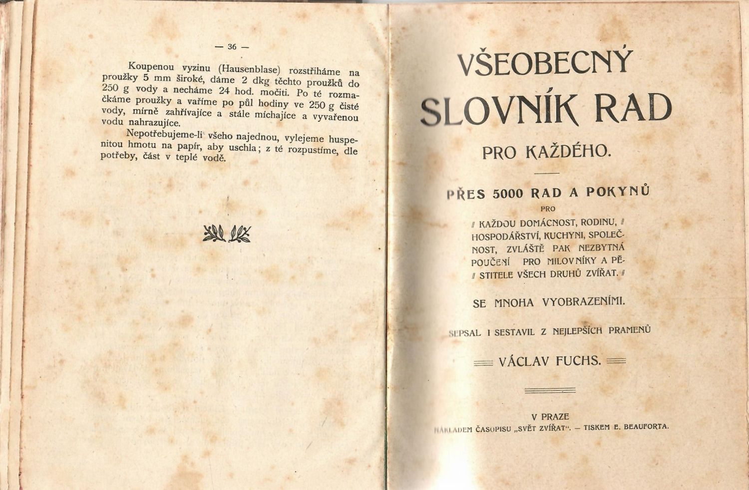 + přívazek: Fuchs, Václav "Všeobecný slovník rad pro každého. Přes 5000 rad a pokynů pro každou domácnost, rodinu, hospodářství, kuchyni, společnost, zvláště pak nezbytná poučení pro milovníky a pěstitele všech druhů zvířat". Praha, nákl. časopisu Svět zvířat, tiskem E. Beauforta, [1906], 704 (z 1396 stran). Text končí u písmene M a hesla "Mor". V textu několik černobílých vyobrazení.