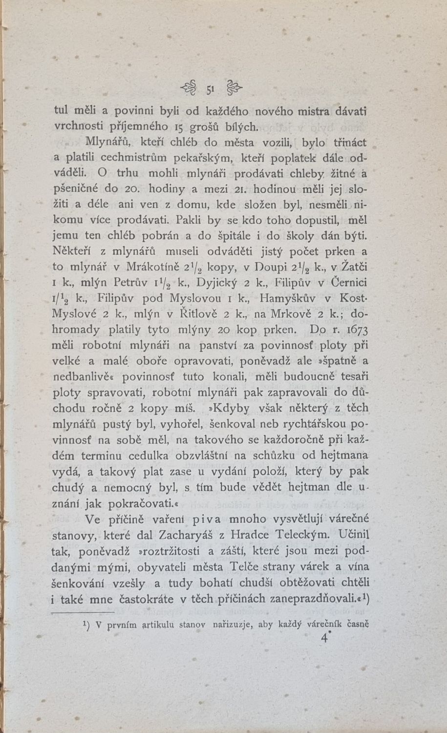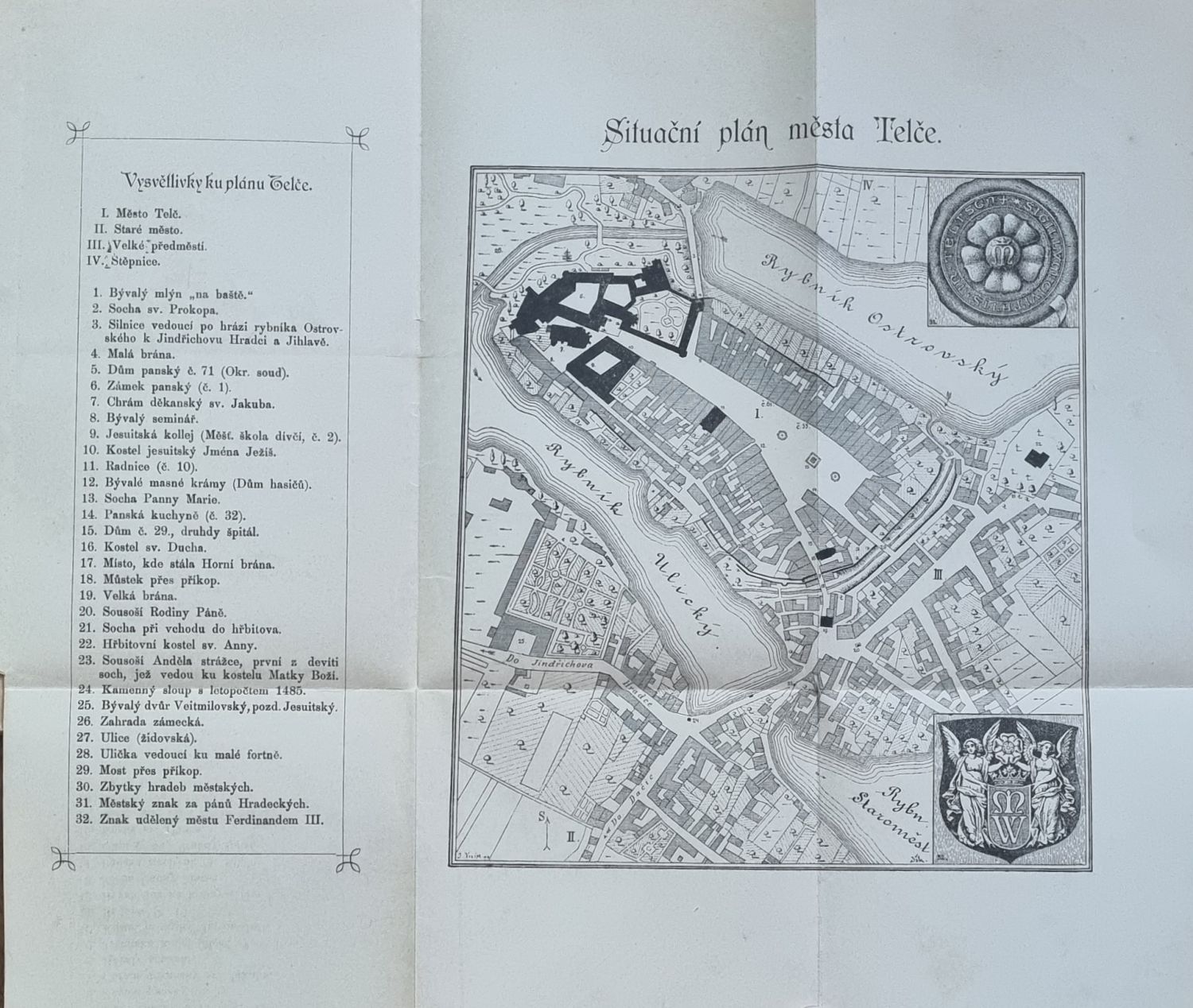 Ve front. reprodukce fotografie s vyobrazením náměstí v Telči, za textem rozkládací situační plán města Telče s vysvětlivkami. V záhlaví úvodu jednotlivých kapitol pásové vlysy zdobené ornamenty a plné iniciály umístěné v rostlinné kompozici.