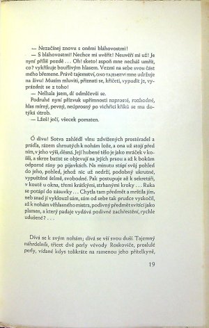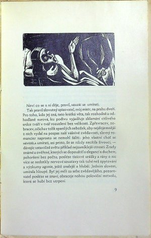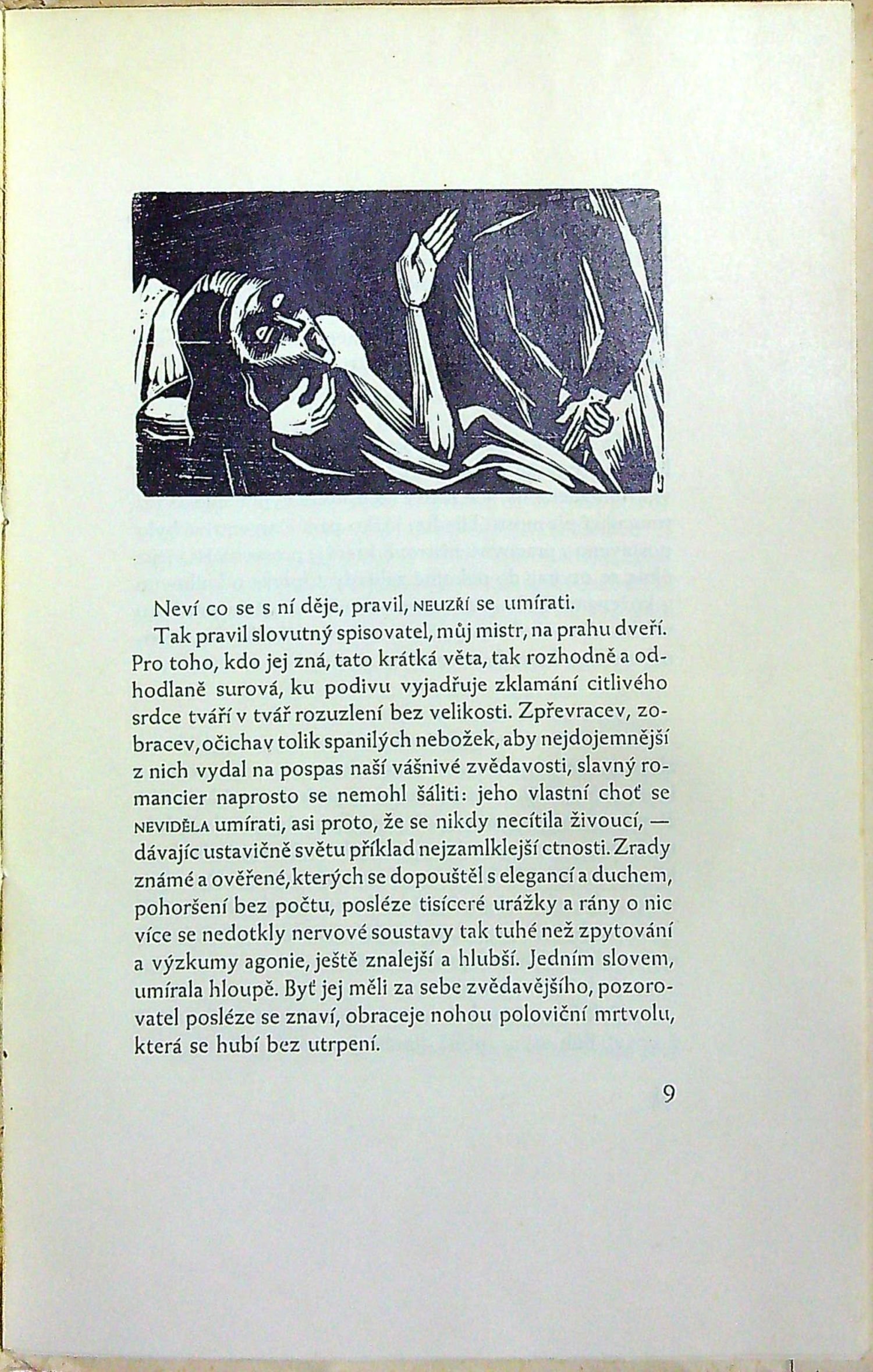 Ex. č. 186 z 200 ex. tištěných na dílový papír (krom toho bylo 50 ex. tištěno na Van Gelder). Dvoubarevně tištěný tit. list a stránka s mottem, tiskl Antonín Vokolek. Přední strana obálky při spodním i horním okraji mírně pomačkaná.