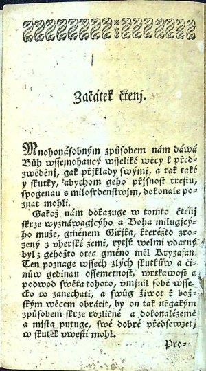 Tištěno švabachem, na tit. listu dřevořez v dvojrámečku 64x49 mm s vyobrazením žebrajícího mrzáka před palácem, do kterého vcházejí dva muži. Na rubu titulního listu v záhlaví lišta ze zdobných paragrafů a uprostřed s drobnou rostlinnou ozdůbkou. Nepaginováno, signatury A-8,B-8,C-7), stránkové kustody. Ve složce B chybně vytištěny a svázány folia B7 a B8 (na rubu folia B-8b vytištěno folio B-7b; na rubu folia B-8a vytištěno folio B-7a). - Pokud není nabízený exemplář Z největší pravděpodobností se jedná o tisk A. J. Landfrase z konce 20.let 19. století (stejnou lištu použil Landfras v jiných jím vydaných anonymních tiscích). Vydávání antidatovaných tisků bylo Landfrasovou specialitou, pokud neměl schválenou censuru.