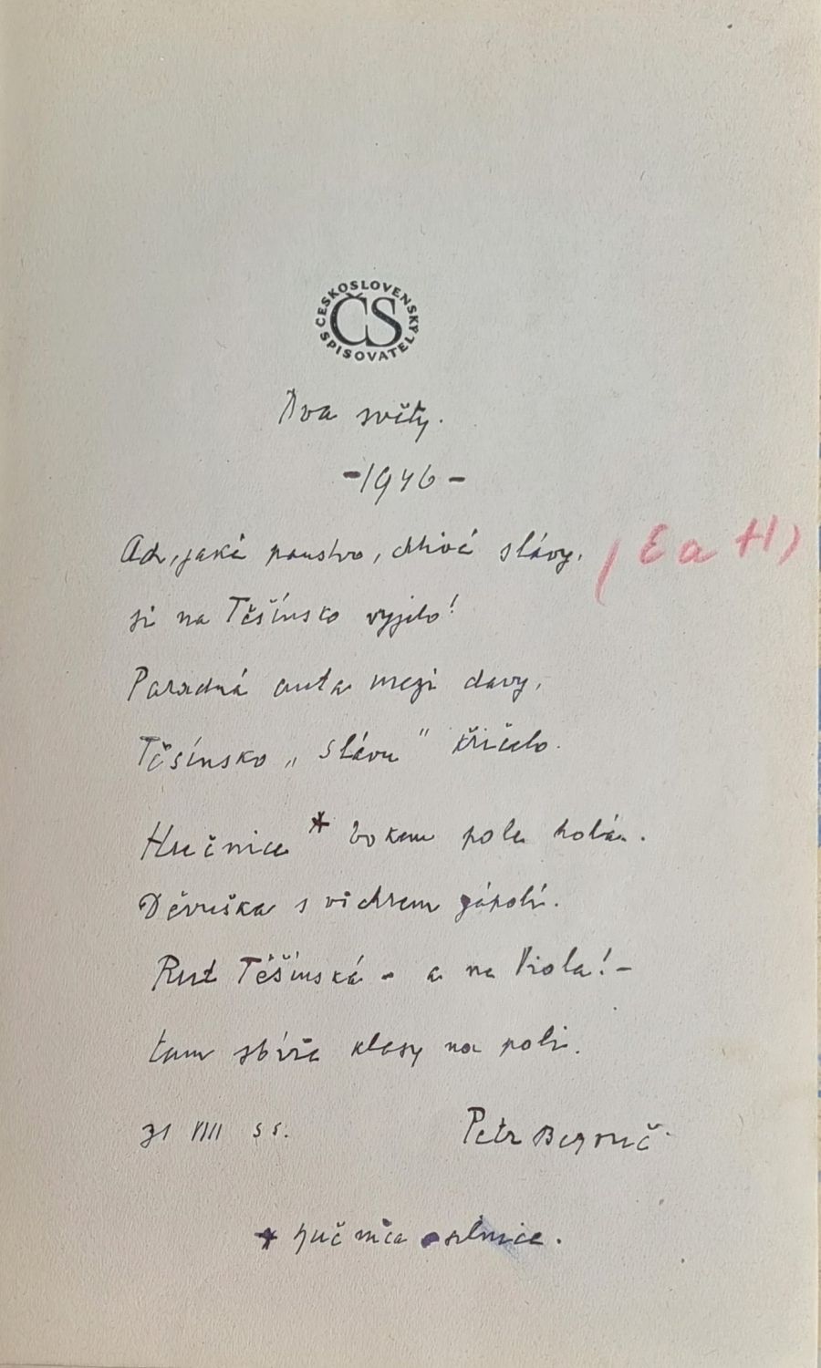 V knize rukopisná dedikace Petra Bezruče. Původní papírová obálka vevázána. Na přední desce knihy při spodním okraji dvě skvrny od červeného inkoustu. Ve hřbetu tlačený a zlacený název knihy. Zlacená ořízka.
