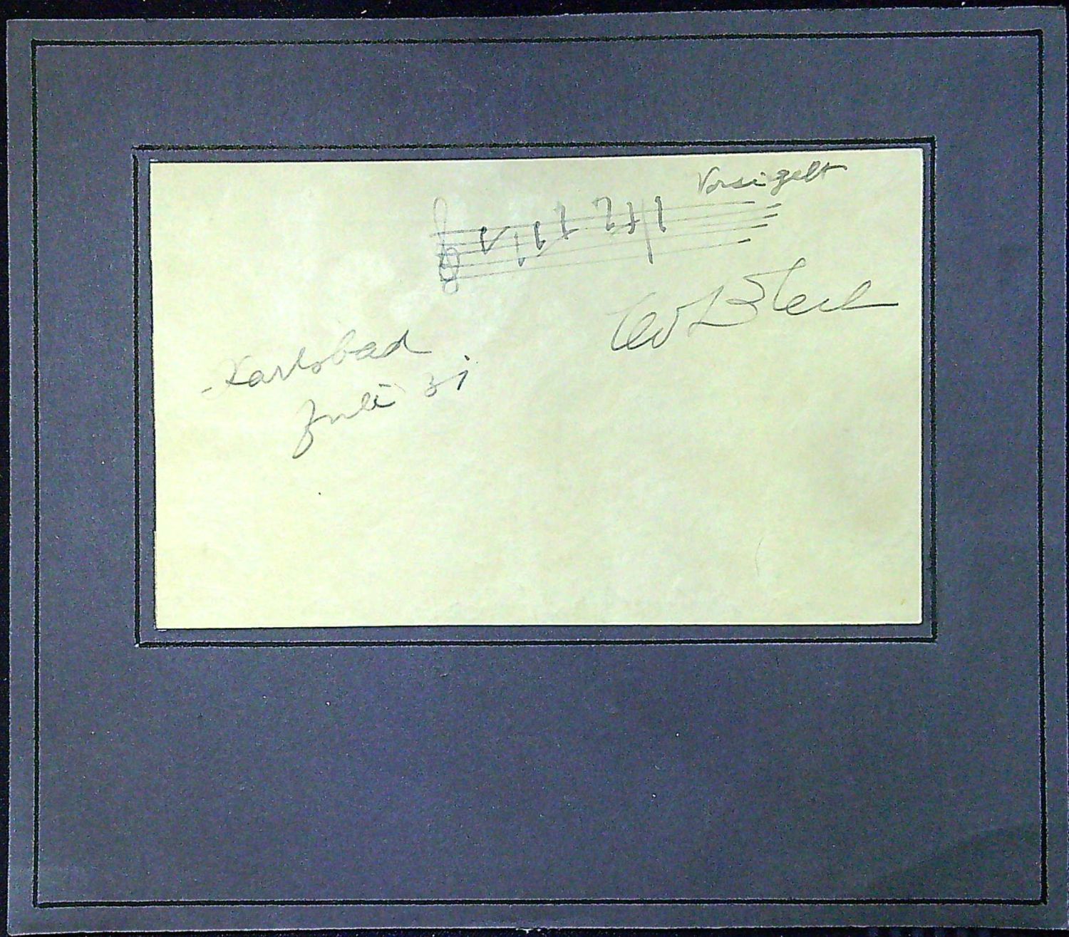 Pětiřádková krátká úvodní notace s podpisem a datací "Karlsbad Juli 31", psaná inkoustem. (rozměr kartičky 85x138 mm).