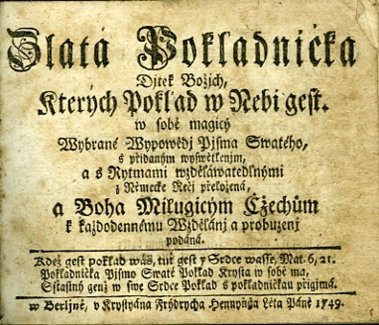 Zlatá Pokladnička Djtek Božjch, Kterých Poklad w Nebi gest, w sobě magicý Wybrané Wypowědj Pjsma Swatého, s přidaným wyswětlenjm a s Rytmami wzděláwatedlnými z Německé Řečj přeložená, a Boha Milugicým Cžechům k každodennému Wzdělánj a probuzenj podáná.