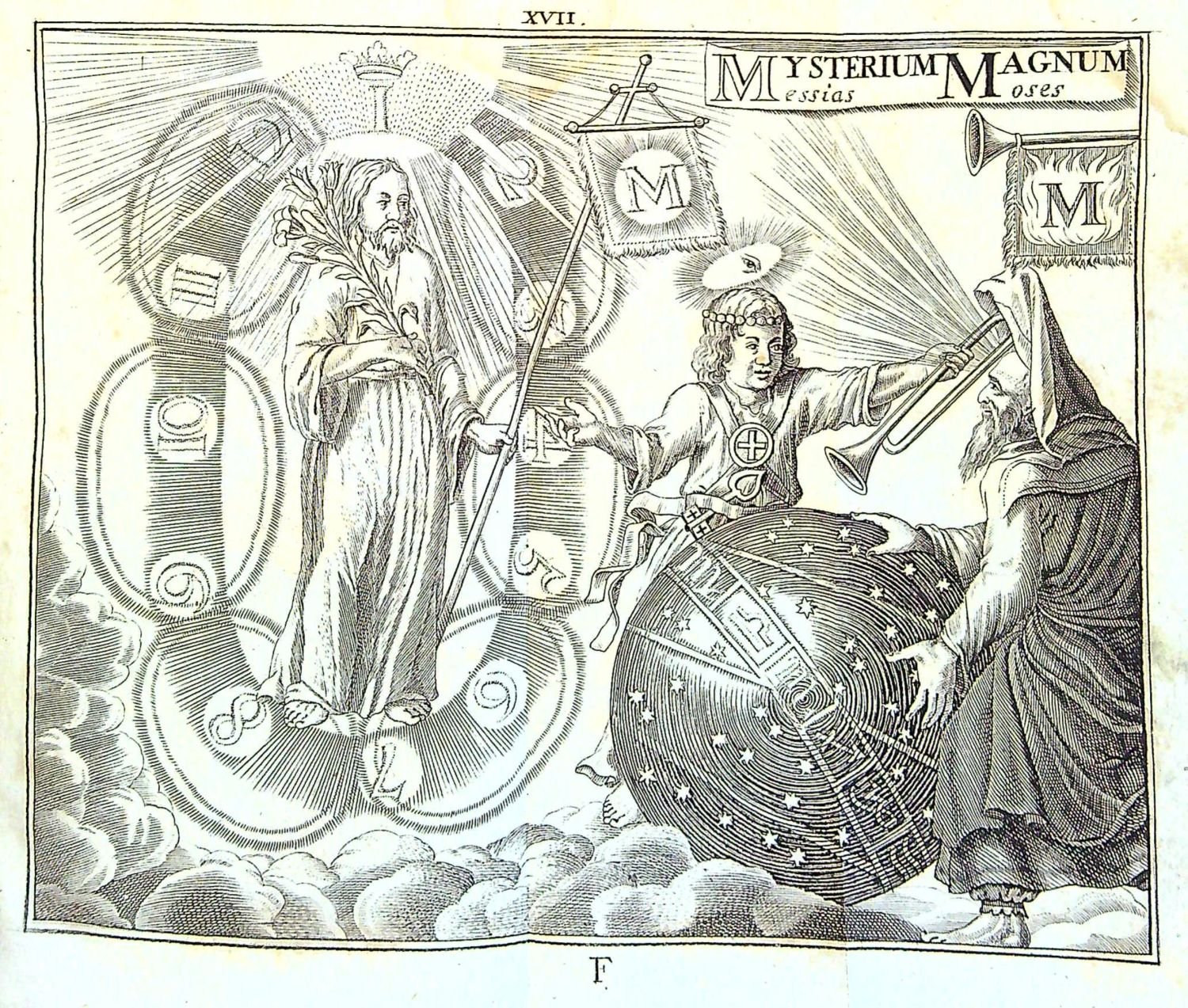 + přívazek: Böhme, Jacob: QUAESTIONES THEOSOPHICA, oder Betrachtung Göttlicher Offenbarung, was GOTT, Natur und Creatur, sowol Himmel, Hölle und Welt, samt allen Creaturen sind; Woher alle Dinge in der Natur ihren Ursprung haben genommen, und wozu GOtt dieselbe habe geschaffen, was sie nütze sind; sonderlich von dem Menschen, Was Adam und Christus sey; durch den gantzen Process und Lauff der Welt bis ans Ende, und die Ewigkeit geführet und in 177 Fragen gestellet Von einem Liebhaber Christi und seiner Kinder, zu mehrerm Nachdencken, was der Mensch sey. Aus rechtem wahren Theosophischen Grunde angefangen zu beantworten, jedoch nicht vollendet, im Jahre 1624, von ...". Bez místa tisku, nakladatele, 1730. [II]-120 str. + 1 mědirytina + 4 tabulky (z toho 3 rozkládací. Plné iniciálky ve výši 2-4 řádků, pásový vlys v jednoduchém rámečku s rostlinným ornamentem, typografická viněta. Mezi stranou 56-57 mezititul "TABULAE PRINCIPIORUM, oder Tafeln von den Dreyen Principien Göttlicher Offenbarung, Wie GOtt ausser der Natur in sich selber, und dann in der Natur, nach den dreyen Principien, betrachtet wird; ....", mezi str. 74-75 mezititul "CLAVIS oder Schlüssel das ist, Eine Erklärung der vornehmsten Puncten und Wörter,..." + list "Summarischer Inhalt". Tištěno švabachem, latinská slova antikvou. Za titulním listem celostránková mědirytina božského zjevení.