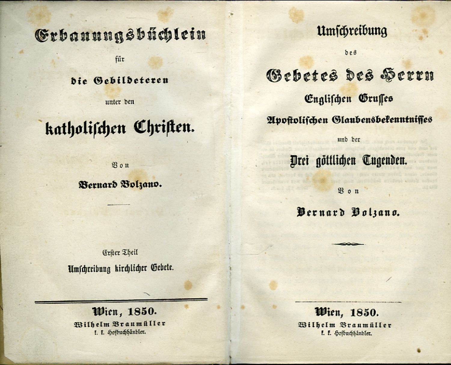 Tištěno frakturou, latinský text antikvou, tištěné poznámky pod čarou, tučně tištěné nadpisy jednotlivých kapitol. Na s. [1]-70 první díl: "Umschreibung des Gebetes des Herrn Englischen Grusses Apostolischen Glaubensbekenntnisses und der Drei göttlichen Tugenden", následuje druhý díl: "Mein Glaube" se samostatným titulním listem. Vpředu Bolzanova předmluva datovaná v Praze o Velikonocích 1820, na začátku druhého dílu předmluva J. M. Fesla datovaná ve Vídni 17.1.1850, za ní předmluva Bolzanova datovaná v Praze 12.5. 1825, na posledních třech nečíslovaných stranách seznam tiskem vydané bolzanovské literatury. - Kartonové desky potažené fialovo-černým mramorovaným papírem, plátěný hřbet a nárožnice, modře mramorované ořízky. Desky odřené, na předních a zadních listech hnědé skvrny.
