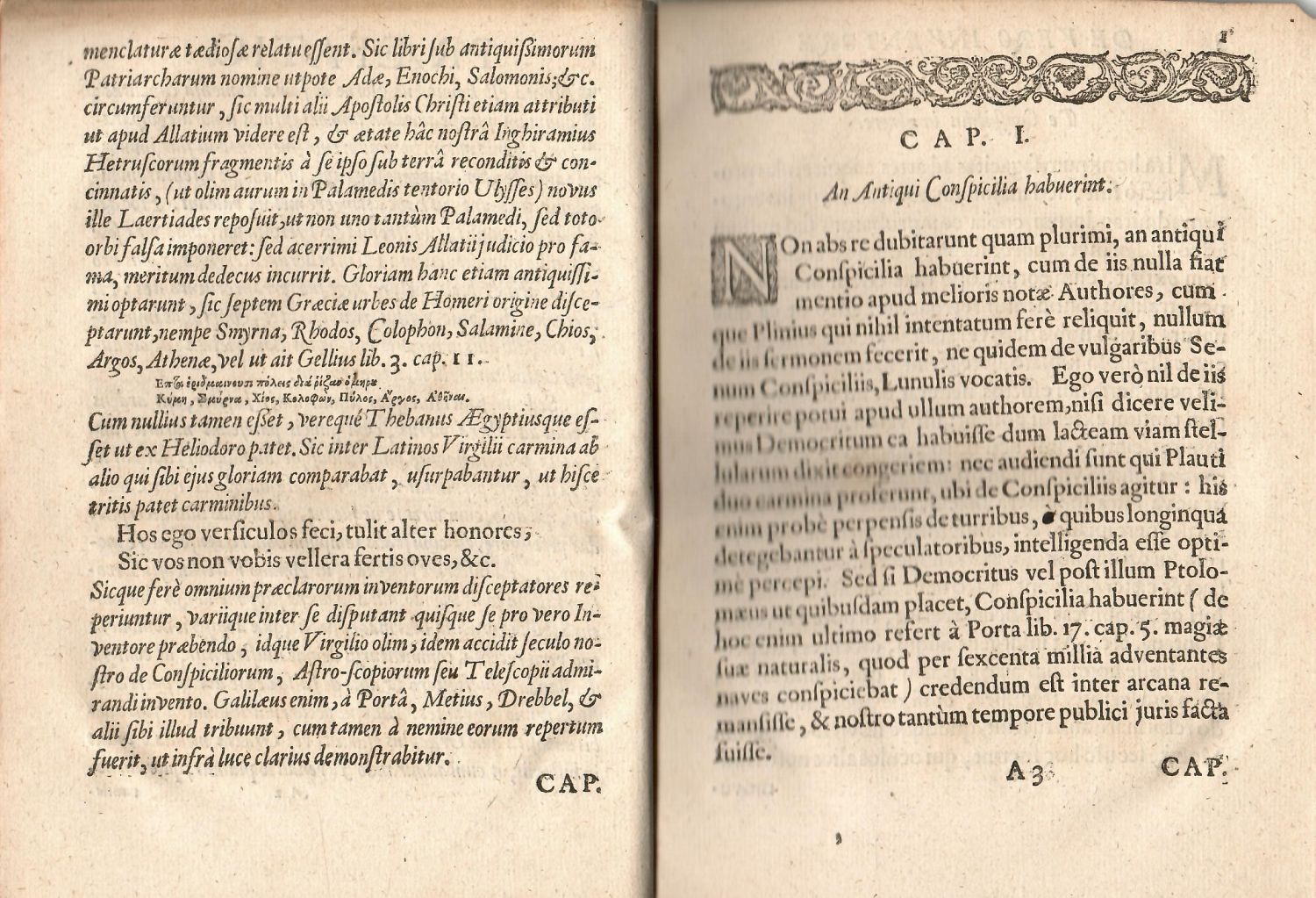 Živá záhlaví, tučně tištěné versálky ve výši 2-3 řádků, pásové tyče z ornamentů, konturové iniciály na rostlinném a ornamentálním pozadí zalomené do výše 3-9 řádků. Tři separátně číslované části, třetí část se samostatným titulním listem "OBSERVATIONVM MICROCOSPICARUM CENTVRIA". Hague, Adrian Vlacq, 1656.