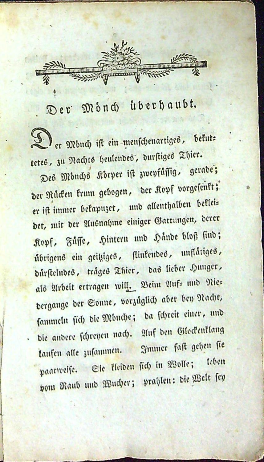 Ignác Born (26.12.1742 Alba Iulia, Sedmihradsko - 24.7.1791 Vídeň), osvícenec, mineralog, geolog, montanista. Od svých dvaceti let žil v Čechách, nejprve studoval na pražské universitě, kde pak později působil jako profesor, přednášel o problematice montánních věd, stal se horním radou v Uhrách a na Slovensku, věnoval se studiu Karpat. Na svém statku u Tachova založil botanickou zahradu, vlastnil rozsáhlou mineralogickou sbírku a rozsáhlou odbornou knihovnu. Z jeho popudu začal vycházet v Čechách první přírodovědecký časopis "Prager gelehrte Nachrichten". V roce 1770 založil Učený klub, ze kterého později vznikla v roce 1773 Královská česká společnost nauk. Mezi jeho blízké přátele a spolupracovníky patřili Františe Josef hrabě Kinský, Gelasius Dobner, Karel Rafael Ungar, Mikuláš Voigt, Joseph Stepling a řada dalších učenců z Čech a Rakouska. Na konci 70. let povolala Marie Terezie Borna do Vídně, kde měl uspořádat císařské mineralogické sbírky, byl jmenován do funkce dvorního rady se starostí o mincovní a hornické záležitosti. Na konci života se zabýval také chemií a zkoumal amalgamaci, o které napsal několik vědeckých děl. Ostře se vymezoval proti církvi a svými myšlenkami a postoji ovlivnil Josefa II. Roku 1772 vydal anonymně ve Vídni satirický pamflet "Státní paruka", ve kterém kritizoval šlechtu. Patřil ke stoupencům Svobodných zednářů, ve Vídni roku 1781 vstoupil do lóže "Wahren Eintracht" a později se stal jejím velmistrem, v roce 1785 se stal provincionálním velmistrem všech rakouských zednářů. Když se císař Josef II. snažil získat nad zednáři kontrolu, lóži v roce 1786 opustil. Pro libretistu Emanuela Schikanedera se stal vzorem pro postavu Sarastra v Mozartově opeře Kouzelná flétna. Nabízená knížka vyšla původně latinsky roku 1783. Jedná se o ostře satirické a velmi vzácné dílko, ve kterém autor odsuzuje všechny mnišské řády jako instituce, které jen pomáhají "zhášet světlo rozumu" a nijak neprospívají skutečné víře a zbožnosti. Knížka vyšla několikrát francouzsky v době francouzské revoluce, česky až broku 1934 ve Volné myšlence.