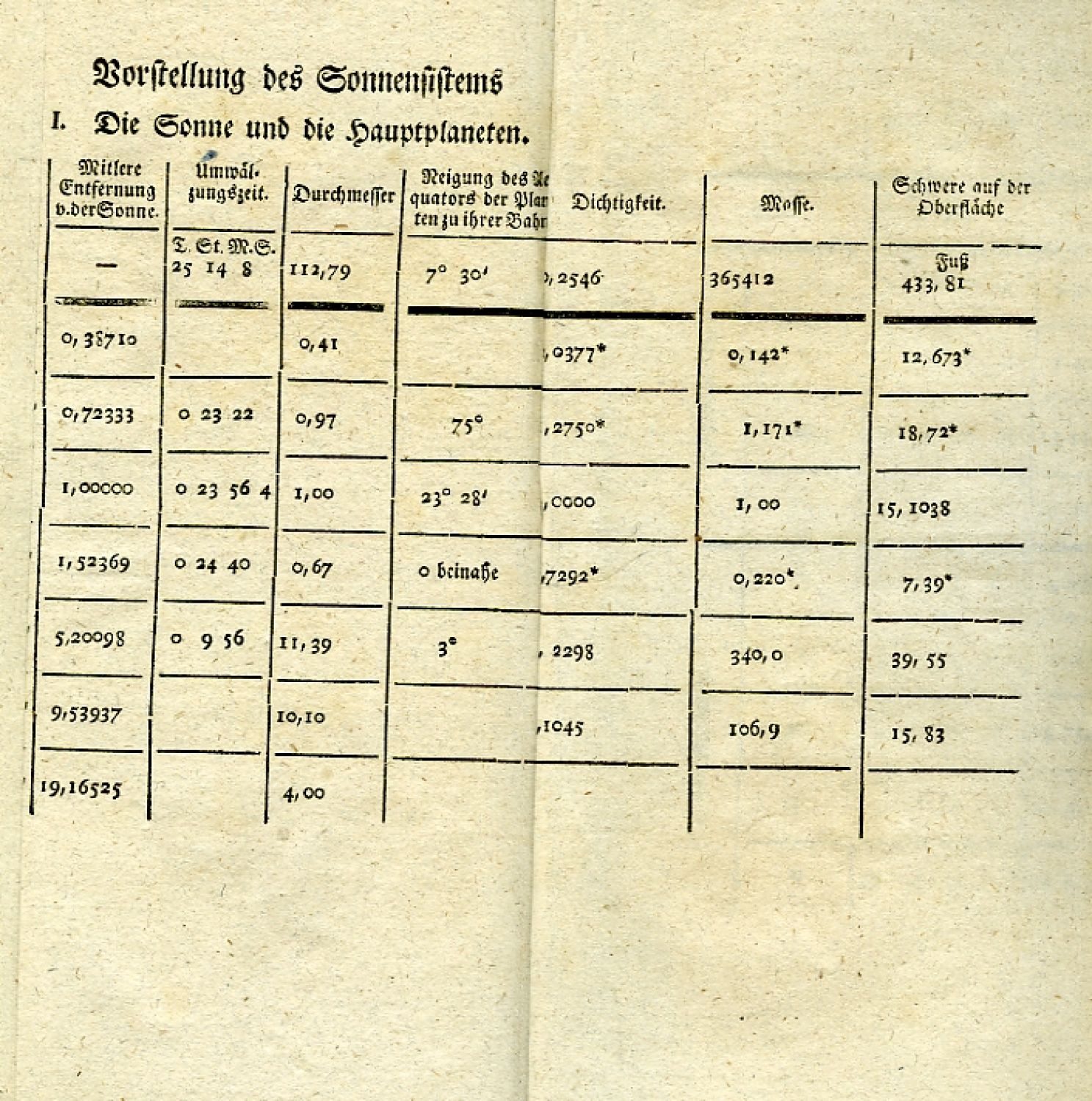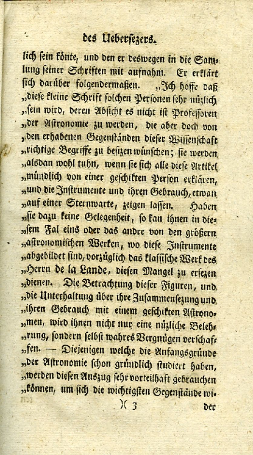 Německý text frakturou, francouzská slova antikvou, signatury, stránkové kustody, živá záhlaví, tištěné poznámky pod čarou. Dva pásové dřevořezové vlysy, tučně tištěné iniciály ve výši 2-3 řádků. V úvodu na třech nepaginovaných listech předmluva překladatelova, za textem dvě rozkládací tabule s číselnými údaji o slunečním a planetárním systému.