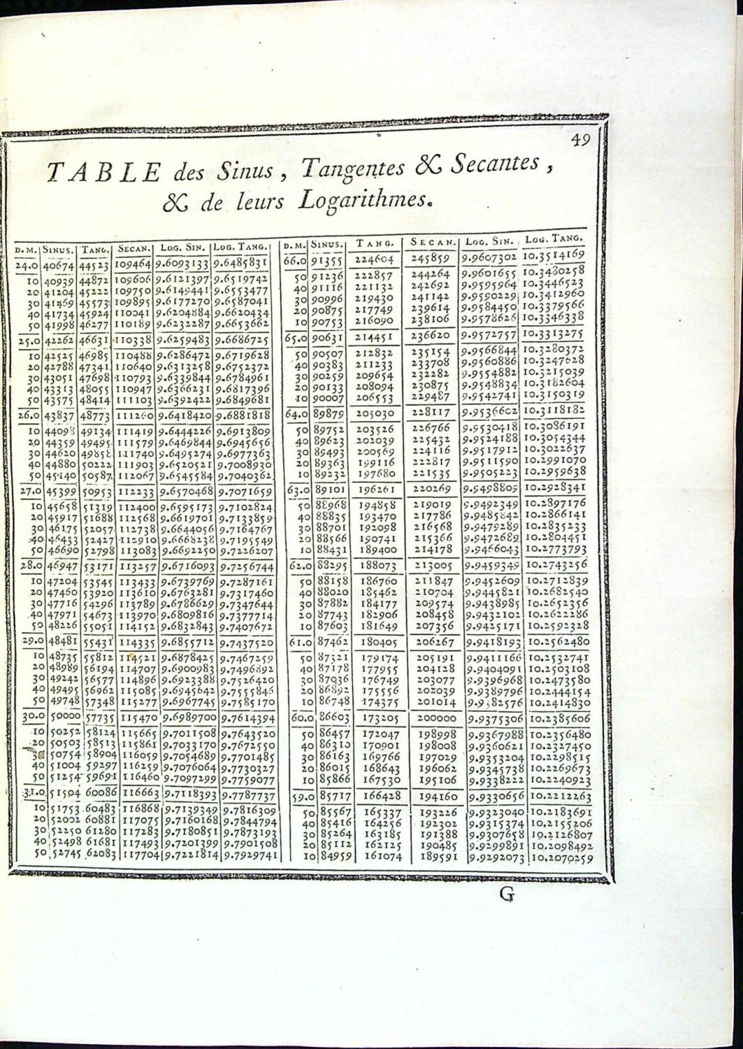 Červeno-černě tištěný titulní list s dřevorytovou vinětou, živá záhlaví, dvojité jednoduché linky, v textu tabulky sinusů, tangensů, sekansů a jejich logaritmů zasazené ve dvojitém jednoduchém rámečku. Vstupní dřevořezový vlys ve dvojitém rámečku rostlinného charakteru, viněty, pásové lišty z ornamentů, tučně tištěné versálky ve výši 2 řádků.