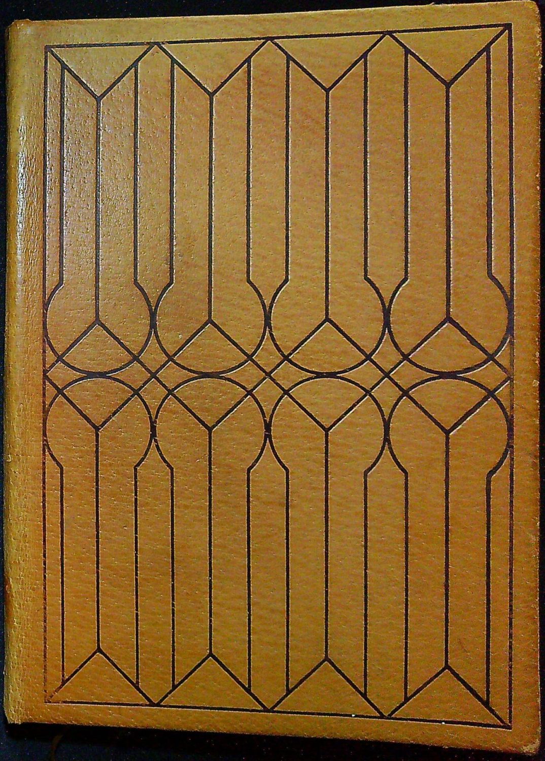 Hnědá kožená vazba s tlačeným geometrickým ornamentem na obou deskách, přes hřbet tlačený název, zlacená svrchní ořízka, ručně šitý kapitálek. Desky vazby se mírně rozvírají.