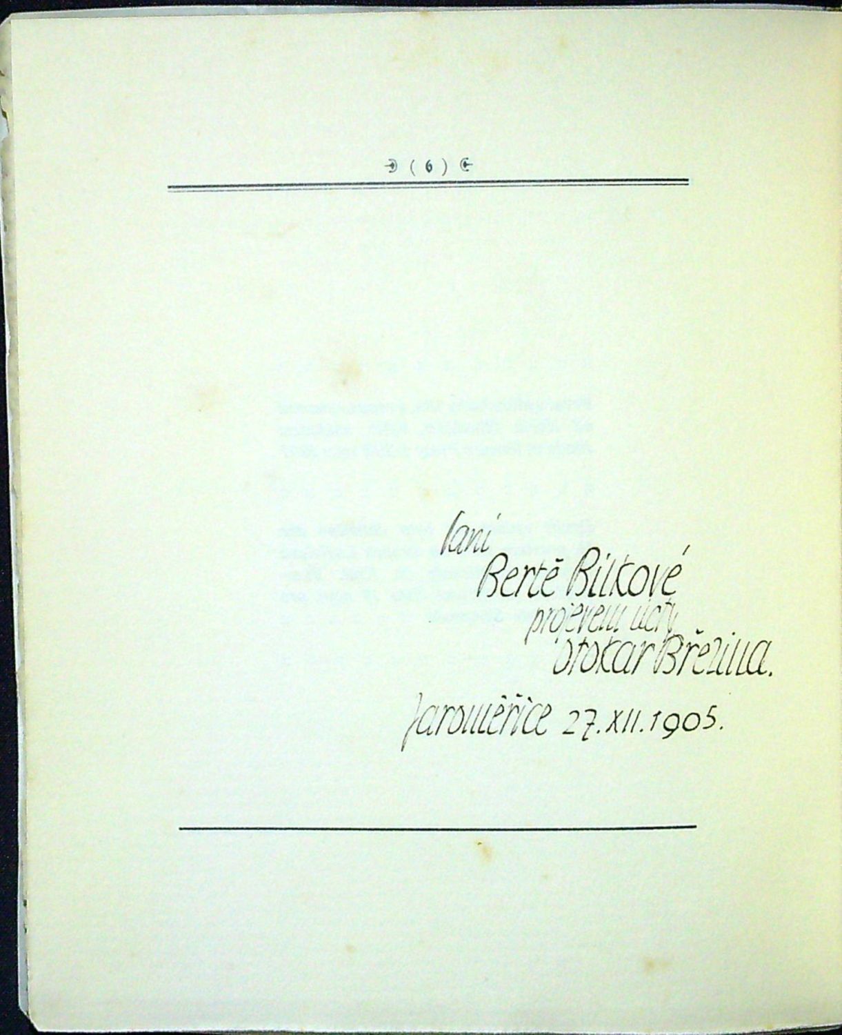 Text básní olemovaný nahoře dvojitou jednoduchou linkou, dole jednoduchou. Na straně 6 rkp. dedikace perem: Paní Bertě Bílkové projevem úcty Otokar Březina. Jaroměřice 27. XII. 1905". (Berta Bílková rozená Nečasová, od roku 1902 manželka Františka Bílka, zemřela v Praze roku 1964). - Dobová pergamenová vazba, lehce zašpiněná, ve hřbetu tlačený a zlacený název, zlacená svrchní ořízka.