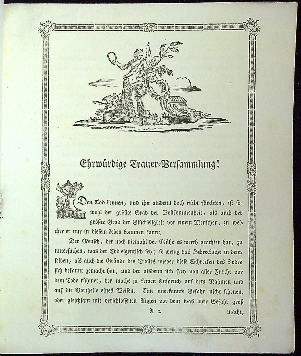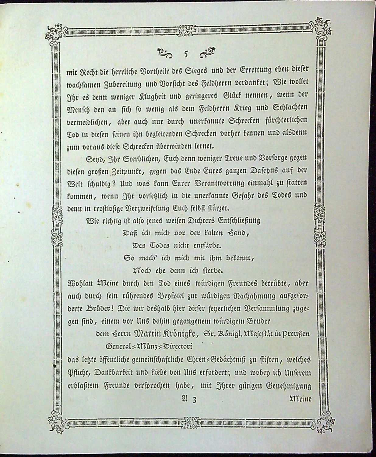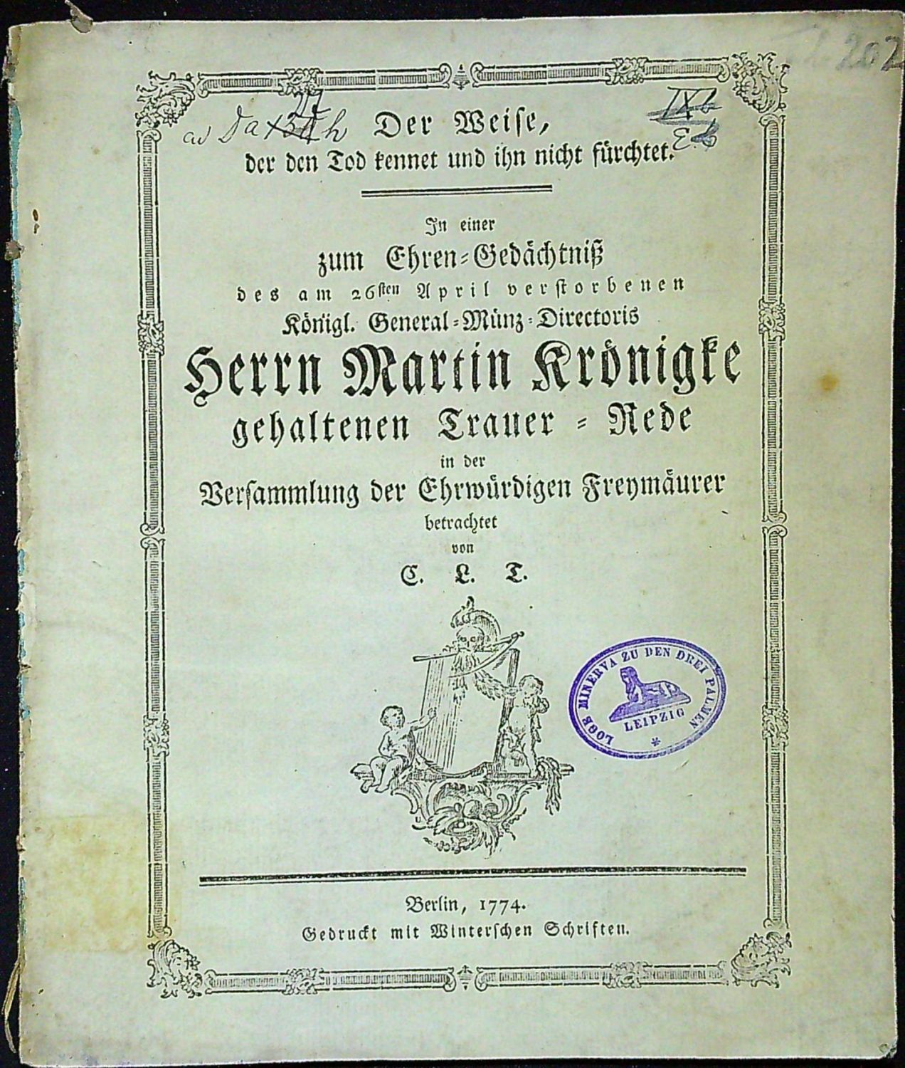 Der Weise, der den Tod kennet und ihn nicht fürchtet. In einer zum Ehren=Gedächtniss des am 26sten April verstorbenen Königl General=Münz=Directoris Herrn Martin Krönigke gehaltenen Trauer=Rede in der Versammlung der Ehrwürdigen Freymäurer betrachtet von C.L.T.