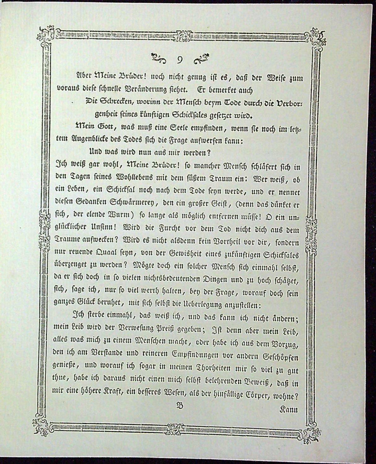 Tištěno švabachem, titulní list i jednotlivé strany olemovány ozdobným rámečkem, na tit. listu viněta, v záhlaví první strany textu vlys a plná iniciálka s ilustrací po straně, arabská paginace stran uprostřed horního okraje mezi prolamovanými lístky, koncová drobná vinětka. - Knižní blok šitý nití, na tit. listu staré razítko zednářské lóže "Minerva zu den drei Palmen" v Lipsku.
