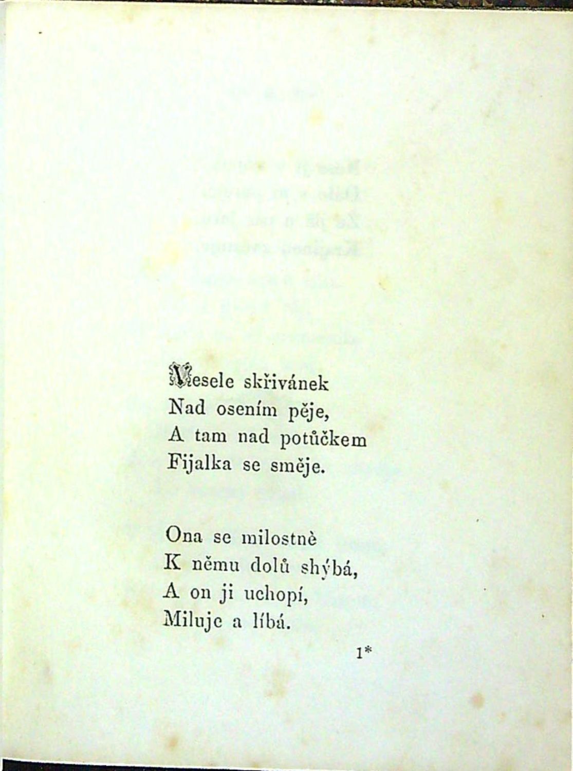 Tištěno antikvou, tučně tištěné iniciálky v úvodu jednotlivých básní, vinětky, uprostřed horního okraje stran arabská paginace stran mezi ozdůbkami z mizící linky. . Dobová vazba s kartonovými deskami potaženými mramorovaným papírem, kožená hřbet a nárožnice. Ve hřbetu tlačený a zlacený název mezi tlačeným a zlaceným ornamentem. Vazba lehce ohmataná, při horním i spodním okraji hřbetu kůže mírně odřená, naražené rohy. Strana VII (obsah) uprostřed téměř po celé výši natržená. V textu tu a tam drobné hnědé skvrnky způsobené kyselostí papíru.