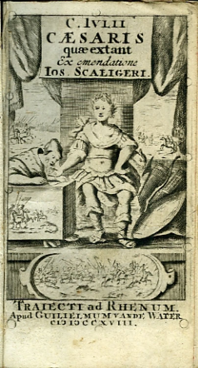 Do mědi rytý titulní list, vstupní pásový vlys z ornamentů, vstupní iniciála na rostlinném pozadí zalomená do výše 7 řádků, tři rozkládací přílohy - mědirytinové mapy s vyobrazeními celé Římské říše doby Caesarovy (88 x 150 mm), Hispánska (86 x 120 mm) a Galie (87 x 120 mm), na straně 434-436 komentář od Alda Manutia, na str. 437-456 geografický slovníček převzatý z díla Abrahama Ortelia "Thesauro Geographico", k vydání připravil a rejstříkem opatřil J. Scaliger. - Joseph Justus Scaliger (4.8.1540 Agen - 21.1.1609 Leiden) byl francouzský humanista, klasický filolog a básník. Působil na universitách v Ženevě a v Leidenu, na počátku 17. století navrhl používání juliánského data, či juliánských dnů podle nového astronomického cyklu, tzv. Scaligerovy juliánské periody, které slouží ke zjednodušení astronomických výpočtů. K tisku připravil řadu děl latinských klasiků.