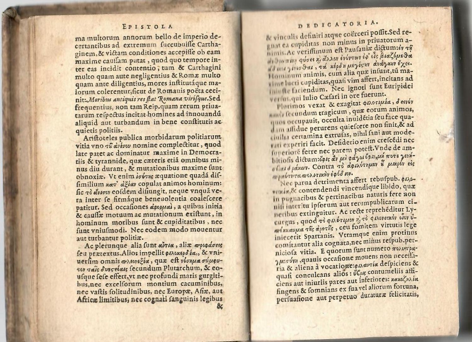 Živá záhlaví, řecká slova alfabetou, na tit. listu viněta, iniciály na rostlinném a ornamentálním pozadí ve výši 6-8 řádků, tučně tištěné versálky ve výši 2 řádků, za indexem mauresková viněta, na 281 (nečíslovaný)titulní list II. části, na jeho rubu epigram od Ph. Melanchtona, v úvodu obou částí tištěné dedikace Melanchtonovy králi saskému a arcibiskupovi magdeburskému, za druhou dedikací viněta. - Dobová renesanční vazba ze světlé vepřovice s tlačeným dvojitým rámem, uvnitř vnitřního rámu slepotisková kompozice z ornamentů, ve hřbetu 4 vazy, vazba ohmataná a místy odřená, naražené rohy, na zadní desce proražená kůže o cca průměru 1 centimetru. Na tit. listu rkp. poznámka perem, na přední předsádce uvolněné z knižního bloku na líci rkp. provenienční záznam "Bonaventura Gauer", na rubu rkp. marginálie se vztahem ke knize.