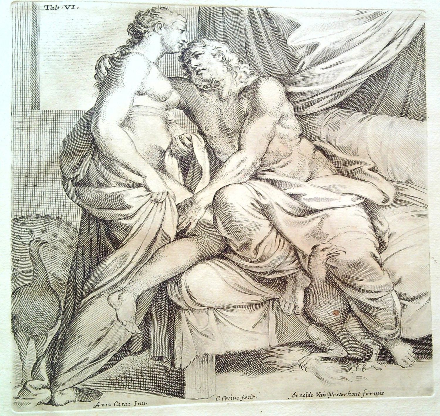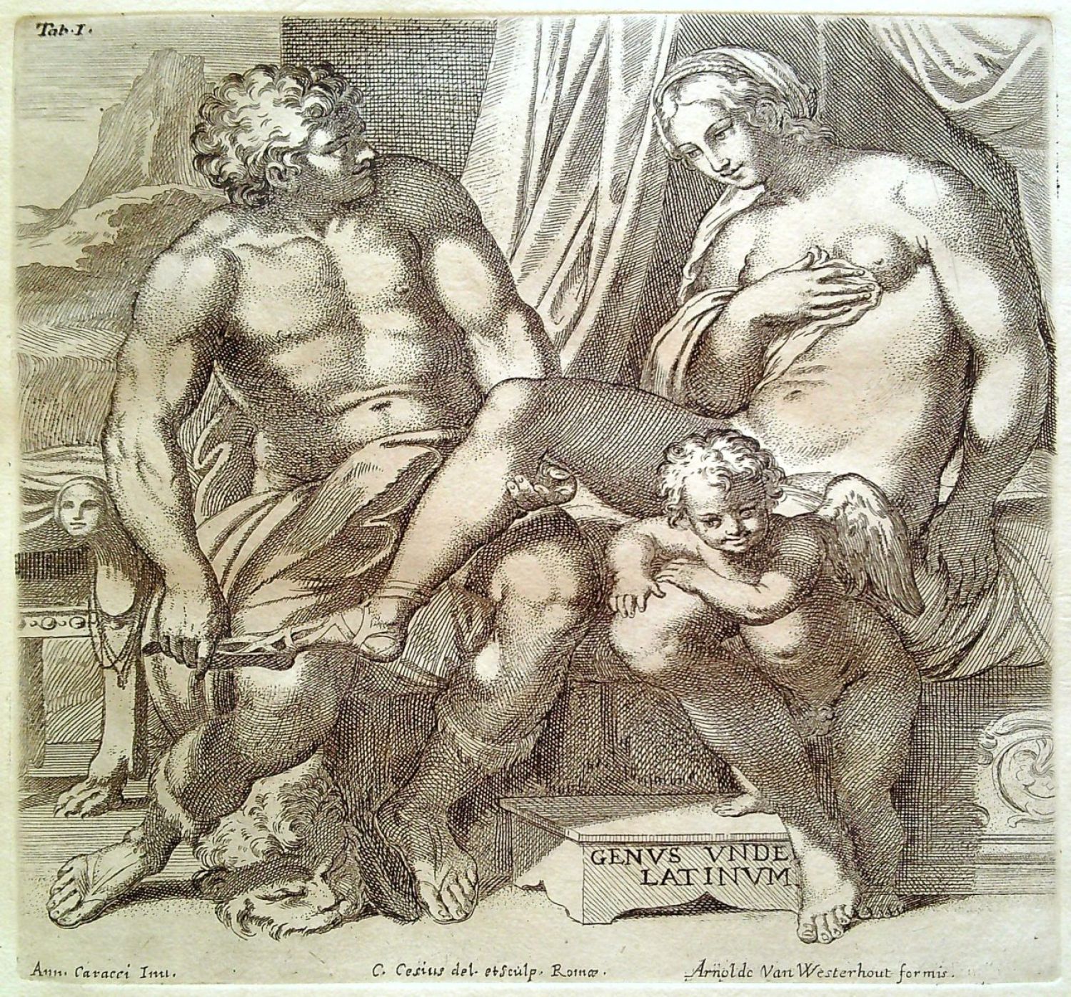 Annibale Carracci (3.11. 1560 Bologna -15.7. 1609 Řím), italský barokní malíř. Na základě svých mistrovských fresek v Palazzo Magnani v Bologni byl doporučen vévodou z Parmy Ranucciem I. Farnese jeho bratrovi kardinálovi Odoardo Farnese, který si přál freskami vyzdobit galerii ve svém Palazzo Farnese v Římě. V roce 1595 začal se svým bratrem Agostinem pracovat na objednávce. Nejprve vymalovali kabinet a pak realizovali hlavní dílo, fresky na stropě velkého salónu, v samotné galerii pak provedli původní objednávku - zobrazení válečných vítězství Alessandra Farnase, které propojili s mytologickou alegorií. V průběhu 17. a 18. století byl strop v Palazzo Farnese považován za bezkonkurenční mistrovské dílo.