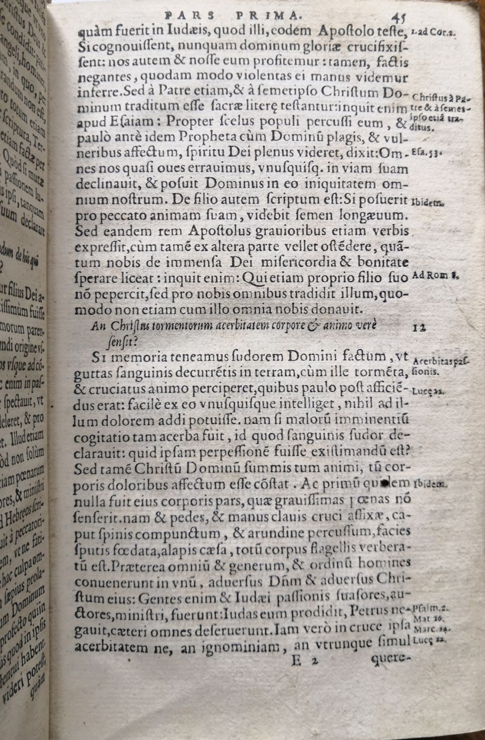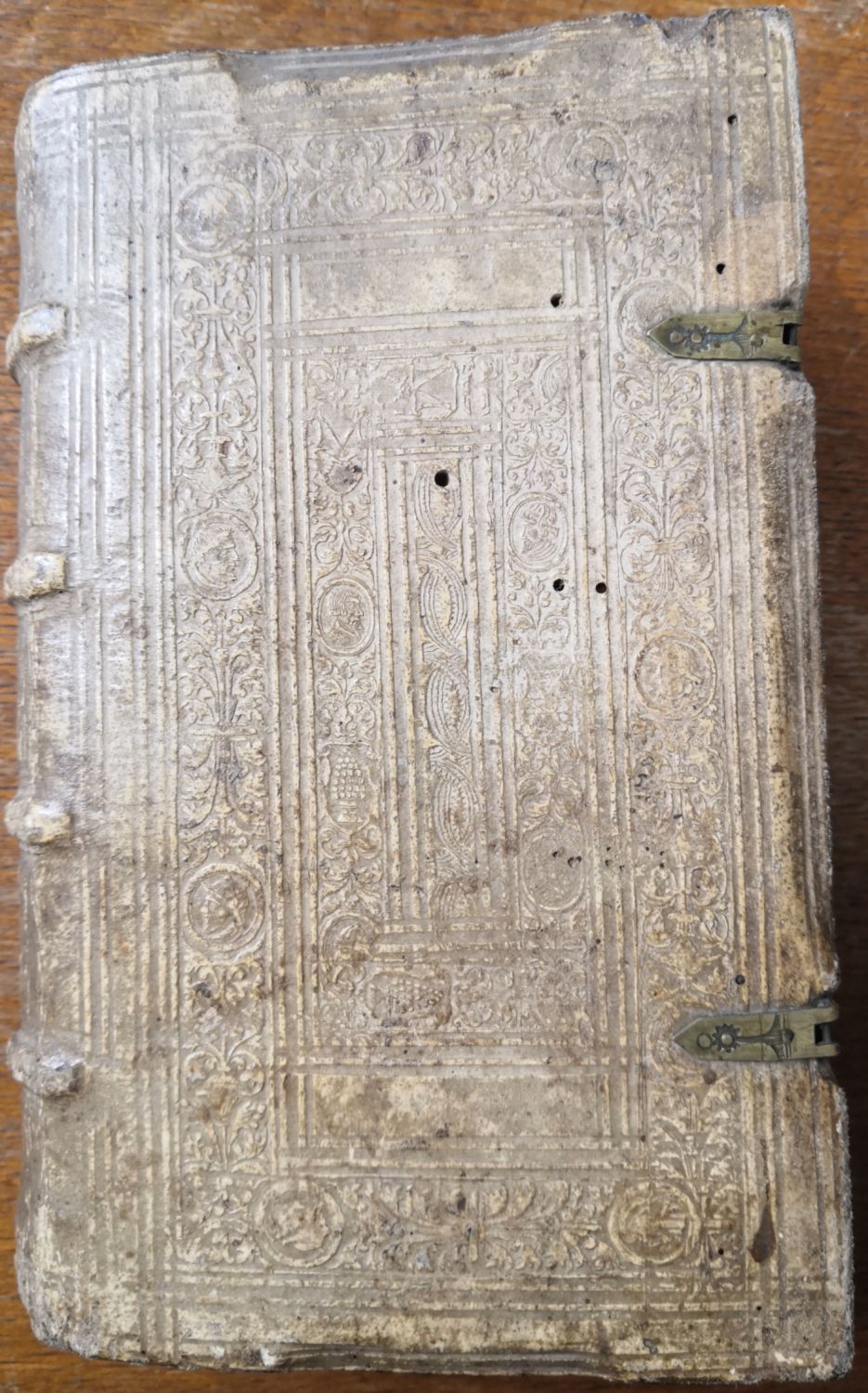 Renesanční vazba z bukových destiček potažených světlou vepřovicí zdobenou slepotiskem, na přední desce dva původní kovové úchyty, na desce zadní dvě torsa kožených přezek, kovové úchyty chybí. Barvené ořízky, ve hřbetu 4 vazy. Na zadní desce vazba zašpiněná. Na přední předsádce rkp. provenience z roku 1750 "Ex libris Josephi ?", na tit. perem vlastnický přípis z roku 1789, papír zažloutlý, knižní blok oříznutý po okraj poznámek.