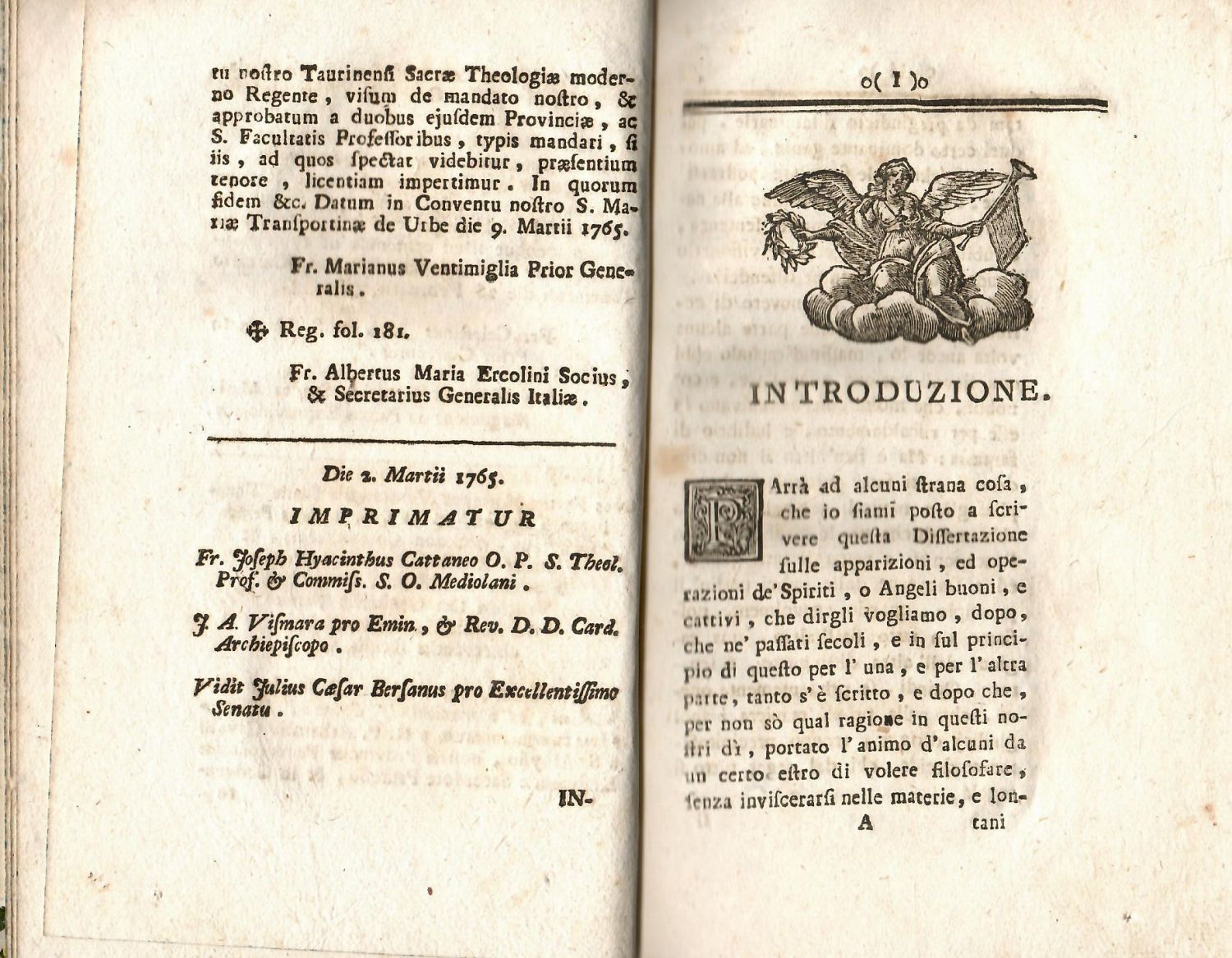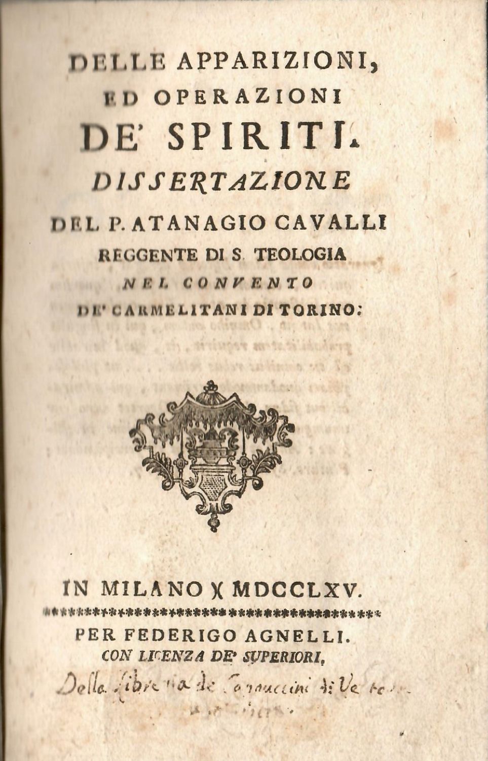 DELLE APPARIZIONI ED OPERAZIONI DE´SPIRITI. DISSERTAZIONE DEL P. ATANAGIO CAVALLI REGGENTE DI S. THEOLOGIA NEL CONVENTO DE´CARMELITANI DI TORINO.
