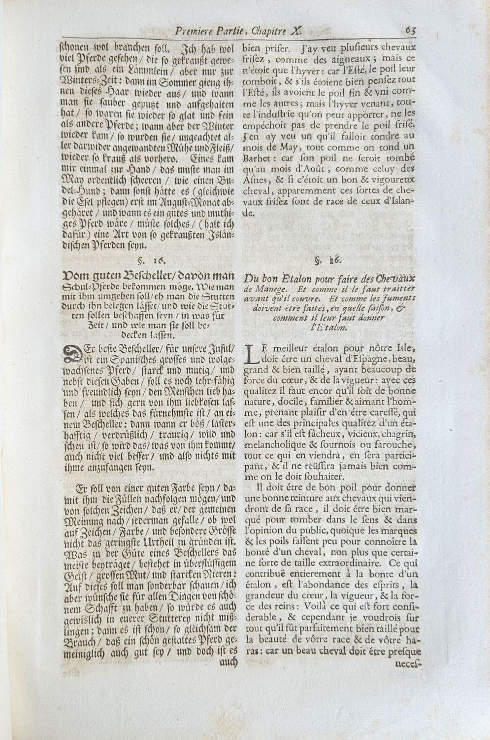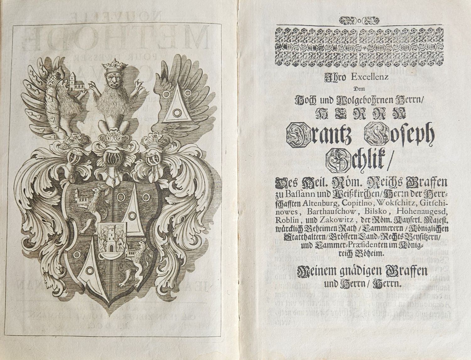 Předtitul, dva titulní listy (prvý německý červeno-černě tištěný), druhý francouzský. Tištěno ve dvou sloupcích (v levém německý text, v pravém francouzský), živá záhlaví od sazby oddělená jednoduchou linkou. Na rubu francouzského tit. listu celostr. mědirytina s vyobrazením erbu hrabat Šliků, v úvodu tištěná dedikace hraběti Františkovi Josefovi Šlikovi. Dřevořezové viněty, pásové vlysy z ornamentů, květin, ilustrací, konturové iniciály zalomené do výše 4-7 řádků, tučně tištěné iniciály ve výši 2 řádků, jednoduché mizící linky. Kniha se skládá ze 4 částí průběžně paginovaných.