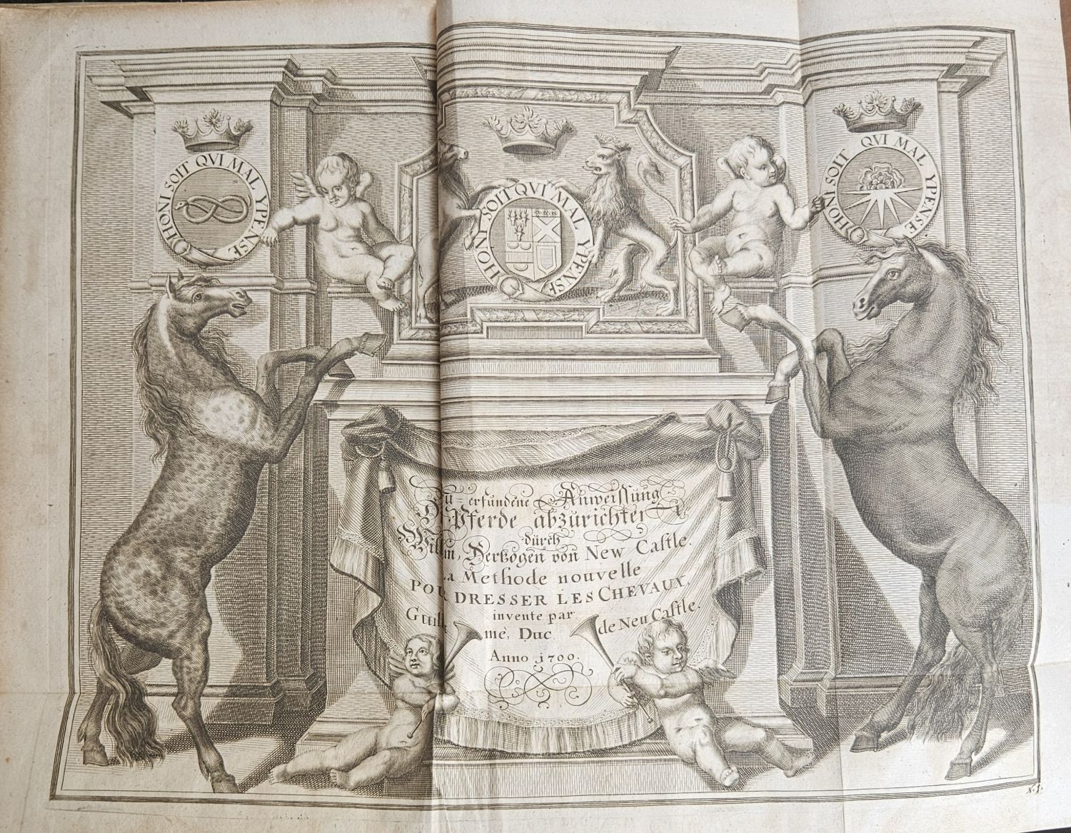 Das Welt=berühmten Hertzog Wilhelms Von NEWCASTLE Neu=eröffnete Reit=Bahn Welche Erstlich durch Ihme selbsten erfunden und in Englischer Sprache ans Licht gebracht; Hernach Durch Herrn von Solleisel/ Königl. Frantzösischen Bereiter/ aus dem Englischen ins Frantzösische versetzt/ mit schönen Anmerckungen/ und die schwereste Puncten erläuterenden Zusätzen/ vermehrt/ und mit nothwendigen Kupfern versehen; Anjetzto aber Dem Hoch=Löbl. Deutschen Adel zu Ehren/ Nutz/ und Vergnügen/ auf ersuchen eines/ der Edlen Pferd= und Reit=Kunst grossen Liebhabers/ Ins reine Teutsche gebracht von Dem Wolgebohrnen Herrn Johann Philipp Ferdinand Pernauer/ Herrn von Pernay/ Freyherrn.
