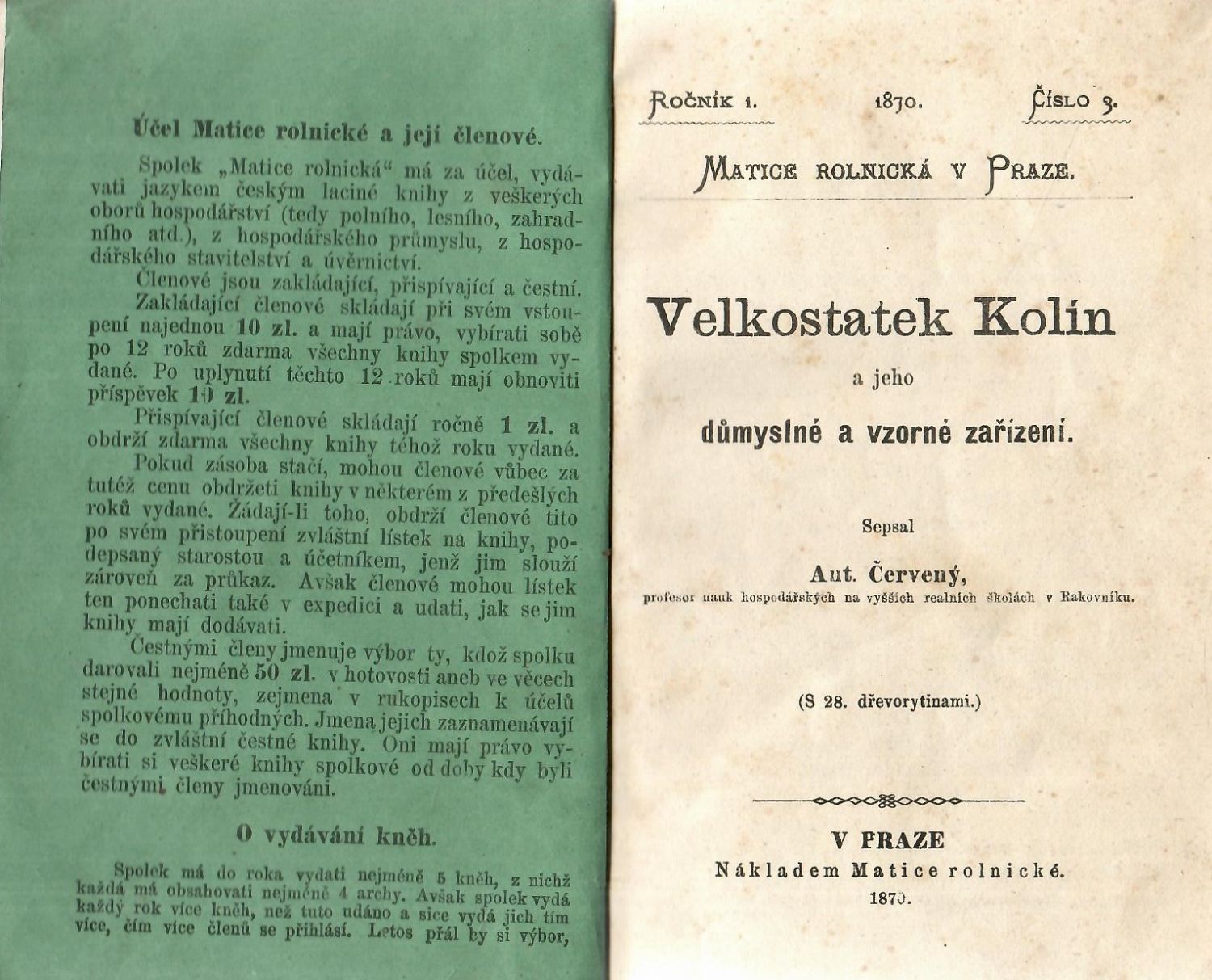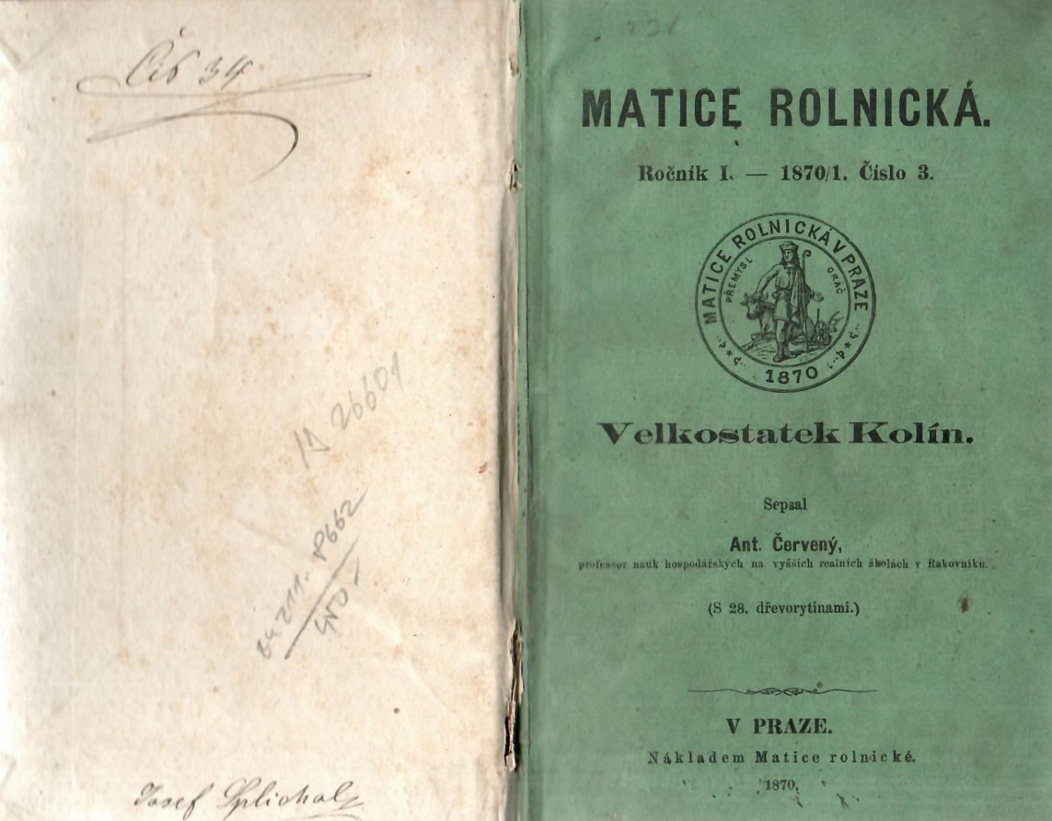 + přívazek: Kraupner, František "O chovu hovězího dobytka", Praha, Matice rolnická, 1871, 132 str. + 13 listů + rozkládací příloha "Rozličné soustavy sestavené dle střídání plodin".