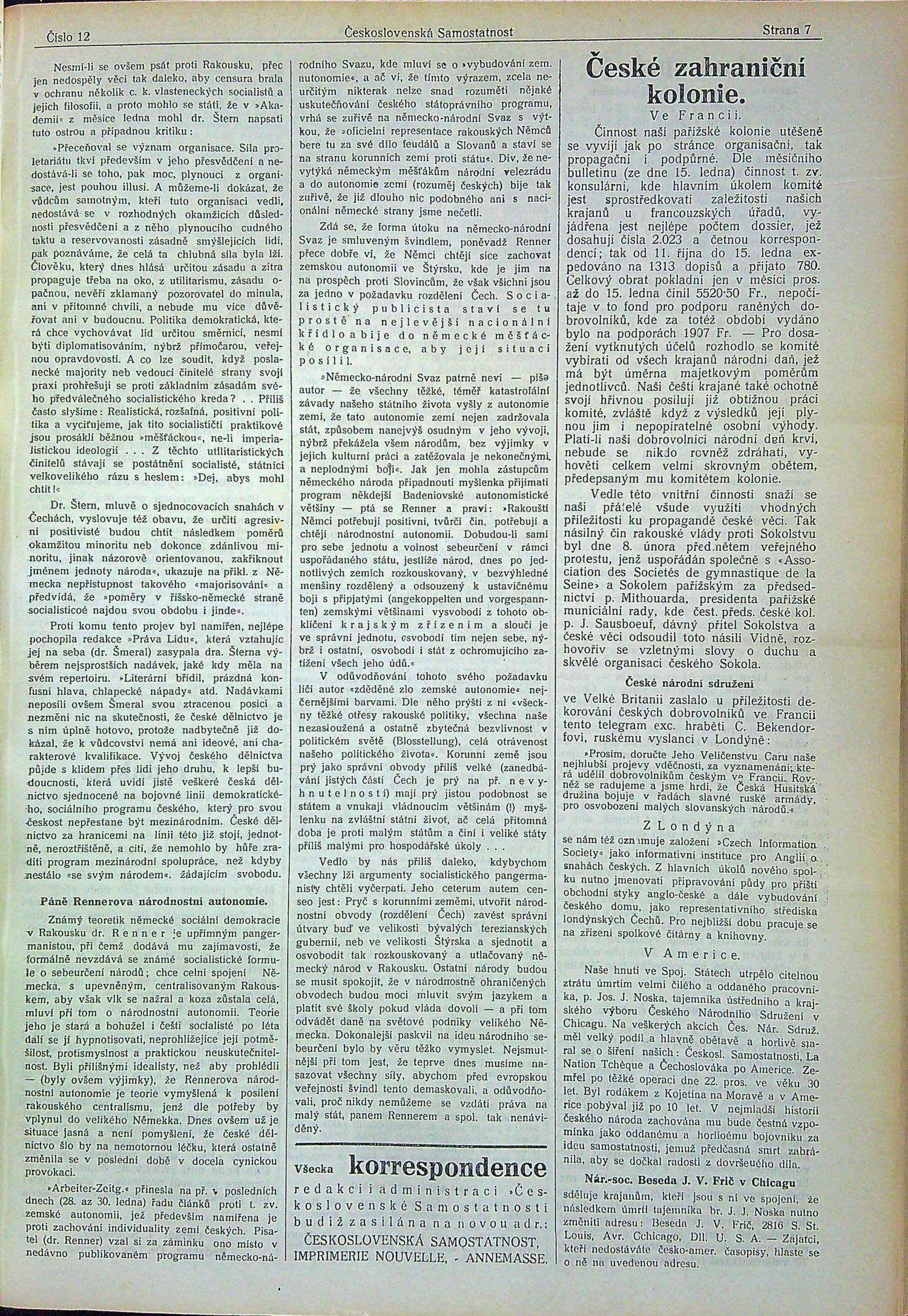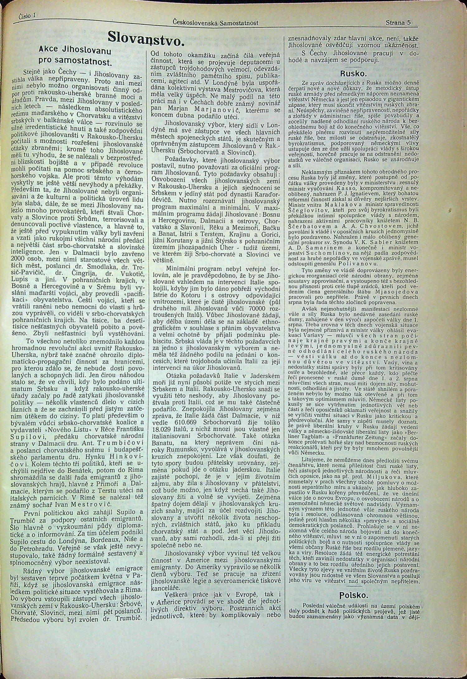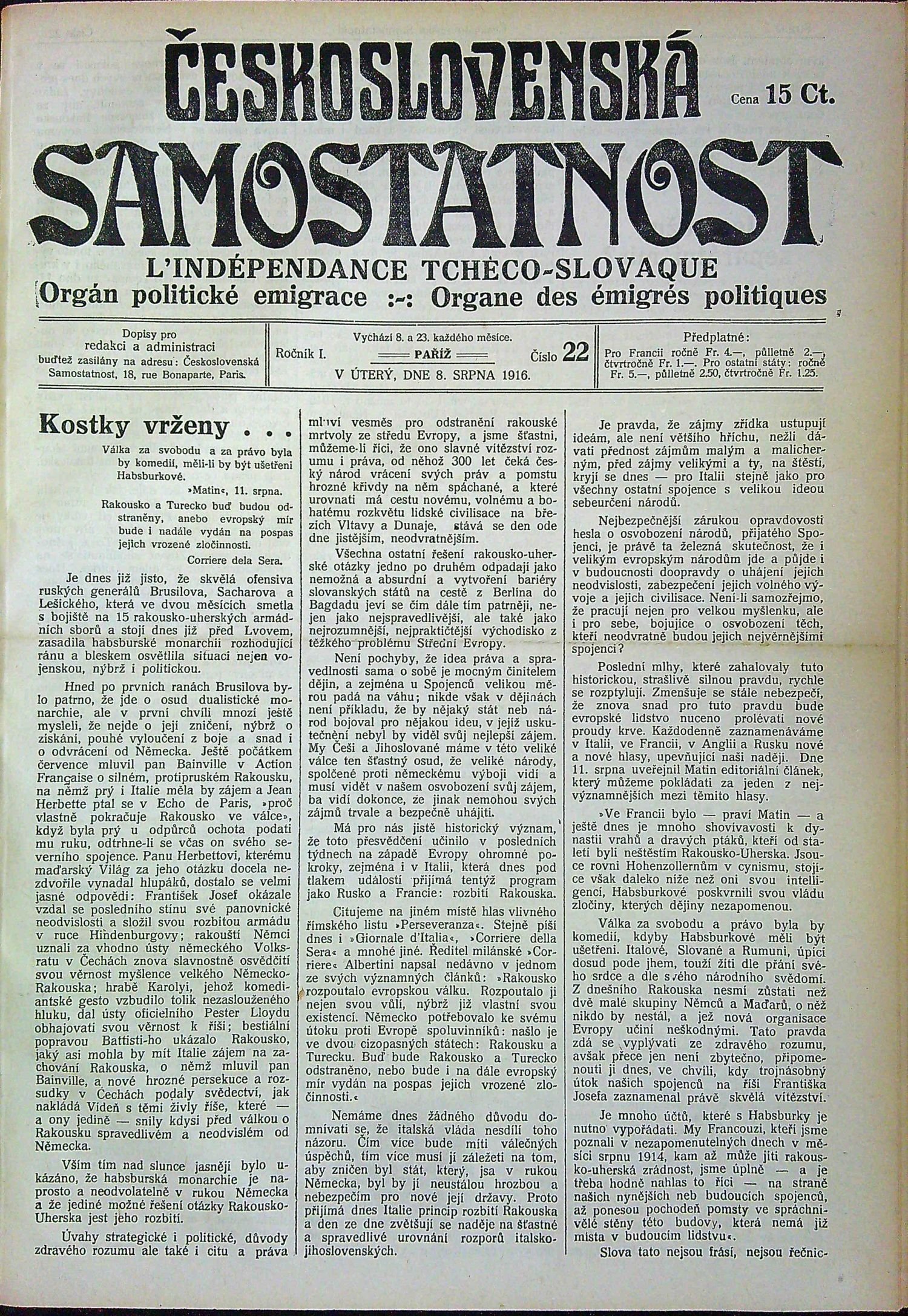 Kompletní vydání časopisu "Československá samostatnost", který vycházel nejprve v městečku Annemasse (do č. 15 prvního ročníku), poté v Paříži. Po vydavateli P. Granchampovi, krátkou dobu časopis vydával J. Schroeder a od čísla 15 prvního ročníku Francois Jackl. První a druhý ročník vyšel ve 24 číslech (á 8 stran), třetí v 38 číslech (á 6 nebo á 8 stran) a poslední ve 32 číslech (á 6 či á 8 stran). Odpovědným redaktorem byl Dr. Lev Sychrava a od čísla 17 4. ročníku Dr. Ivan Markovič. Kromě řady anonymních příspěvků, či opatřených šiframi, v časopisu publikovali mimo jiné TGM, E. Beneš, Karel Horký, Lev Sychrava, M. R. Štefánik. V několika číslech ilustrativní či fotograf. vyobrazení