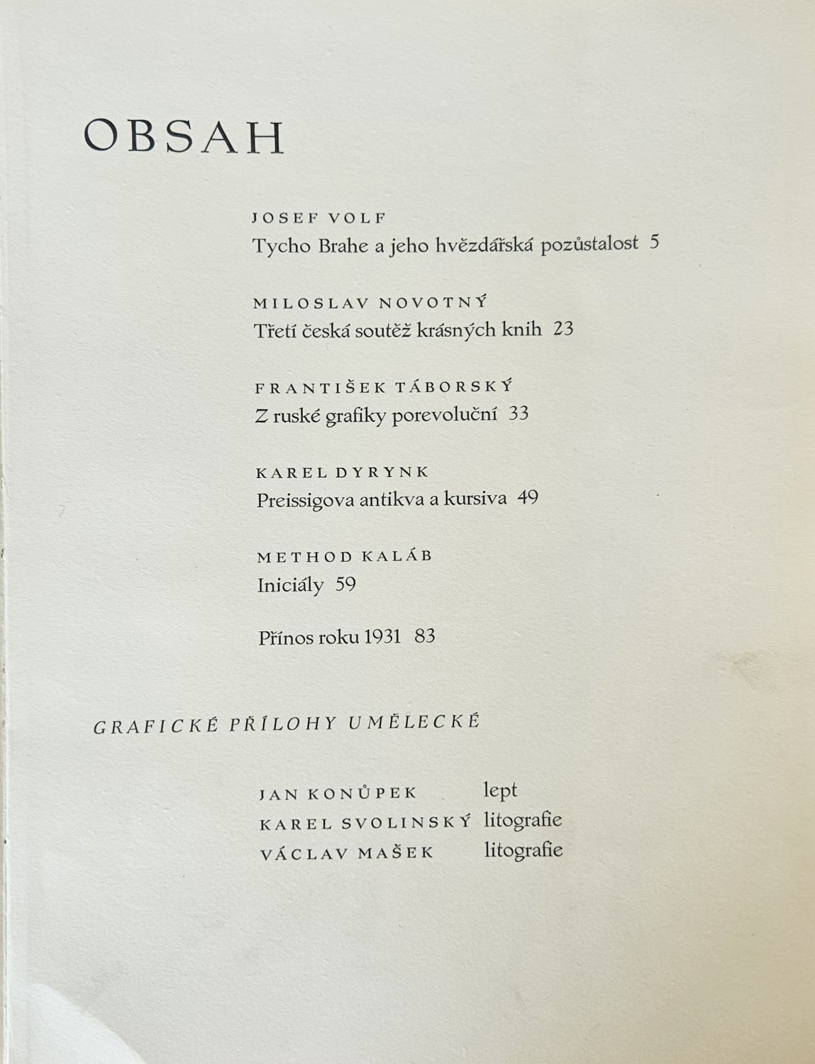 Jeden z 550 vydaných výtisků, které za dohledu Karla Dyrynka vytiskla Státní tiskárna písmem Grégrova Romana. Sborník redigoval Miloslav Novotný za spolupráce M. Kalába a Josefe Volfa, typograficky upravili Method Kaláb a Karel Svolinský. Dvoubarevný tisk, na 21 listech příloh oboustranně potištěných 35 ukázek knih ze III. soutěže o nekrásnější knihu pořádané Spolkem českých bibliofilů v roce 1930. V textu řada vyobrazení (ilustrace, písmo, iniciály). - Původní obálka z tužšího škrobového papíru při okrajích ve hřbetu lehce natržená, ochranné kartonové desky.