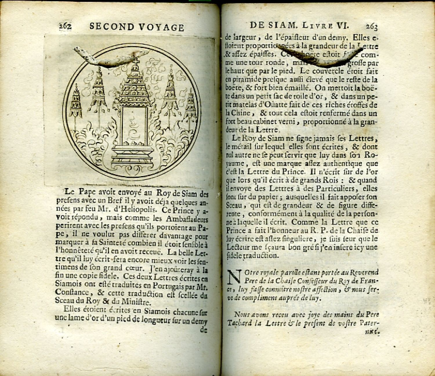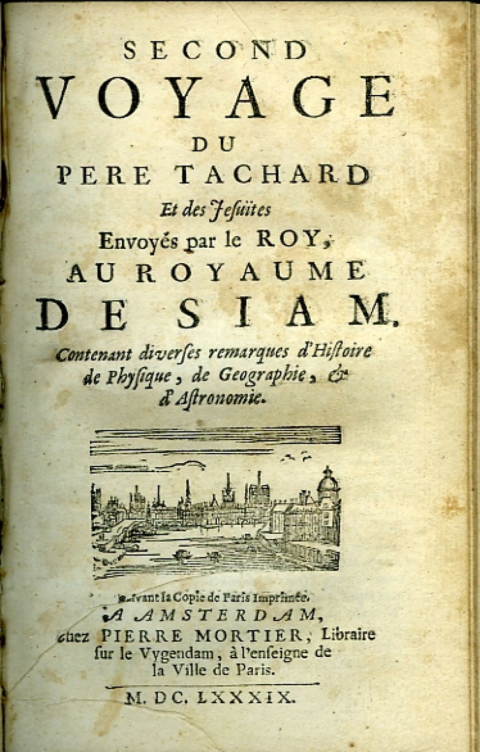 + přívazek: Tachard, [Guy]: SECOND VOYAGE DU PERE TACHARD Et des Jesuites Envoyés par le ROY, AU ROYAUME DE SIAM. Contenant diverses remarques d´Histoire[,] de Physique, de Geographie, et d´Astronomie. Amsterdam, Pierre Mortier, 1689, [IV]-369 (recte 361)-[VII] str. - Nissen ZBI 4067; Backer/Sommervogel VII, 1803. - Na tit. listu dřevořezová viněta s pohledem na město, konturové iniciály na rostlinném pozadí zalomené do výše 5-6 řádků, živá záhlaví tištěná versálkami, šest rozkládacích mědirytinových tabulí s vyobrazením rostlin a živočichů, v textu dvě mědirytiny. - Od str. 168 do konce chybná paginace, počínaje tabulí za str. 250 do konce v horní části listů stopa po červotoči. - Nabízené dílo je 2. vydáním, první vydání vyšlo téhož roku v Paříži.